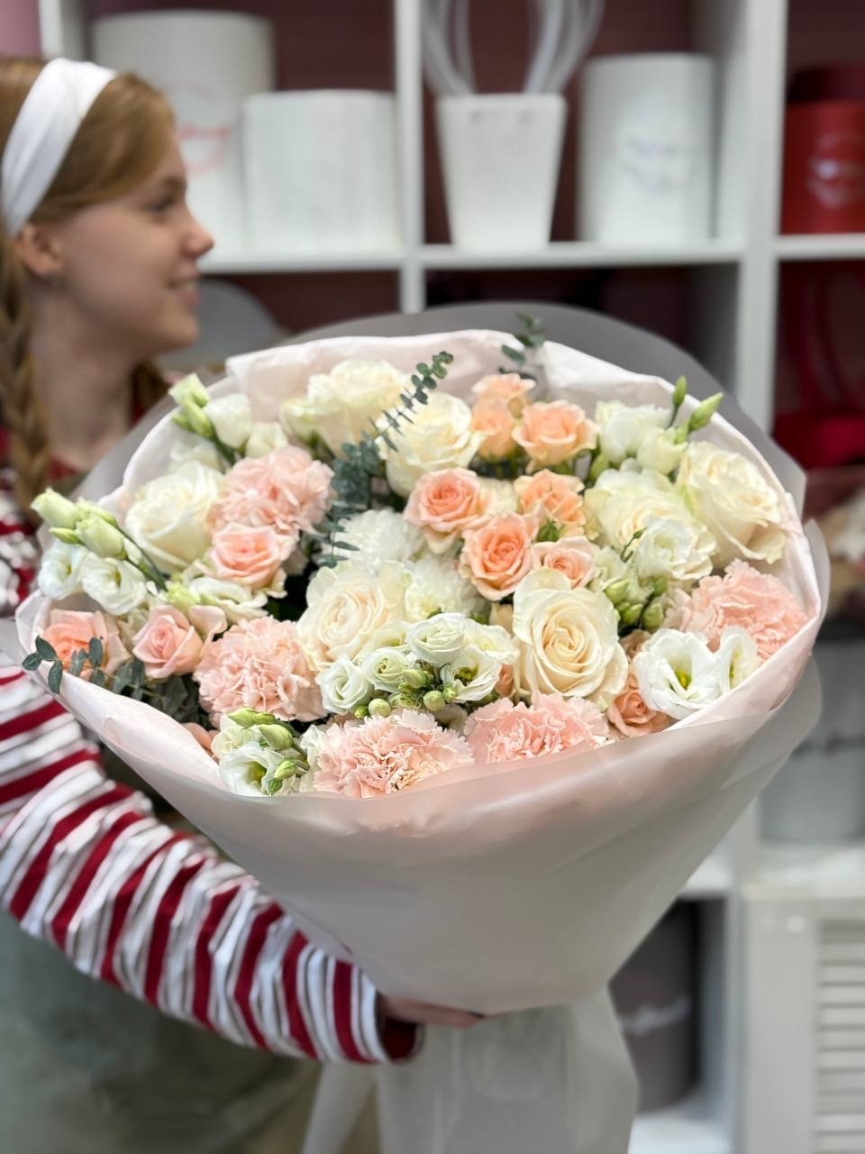 Роза Эквадор, гвоздика, роза кустовая, эустома, хризантема кустовая, эвкалипт, оформление.
