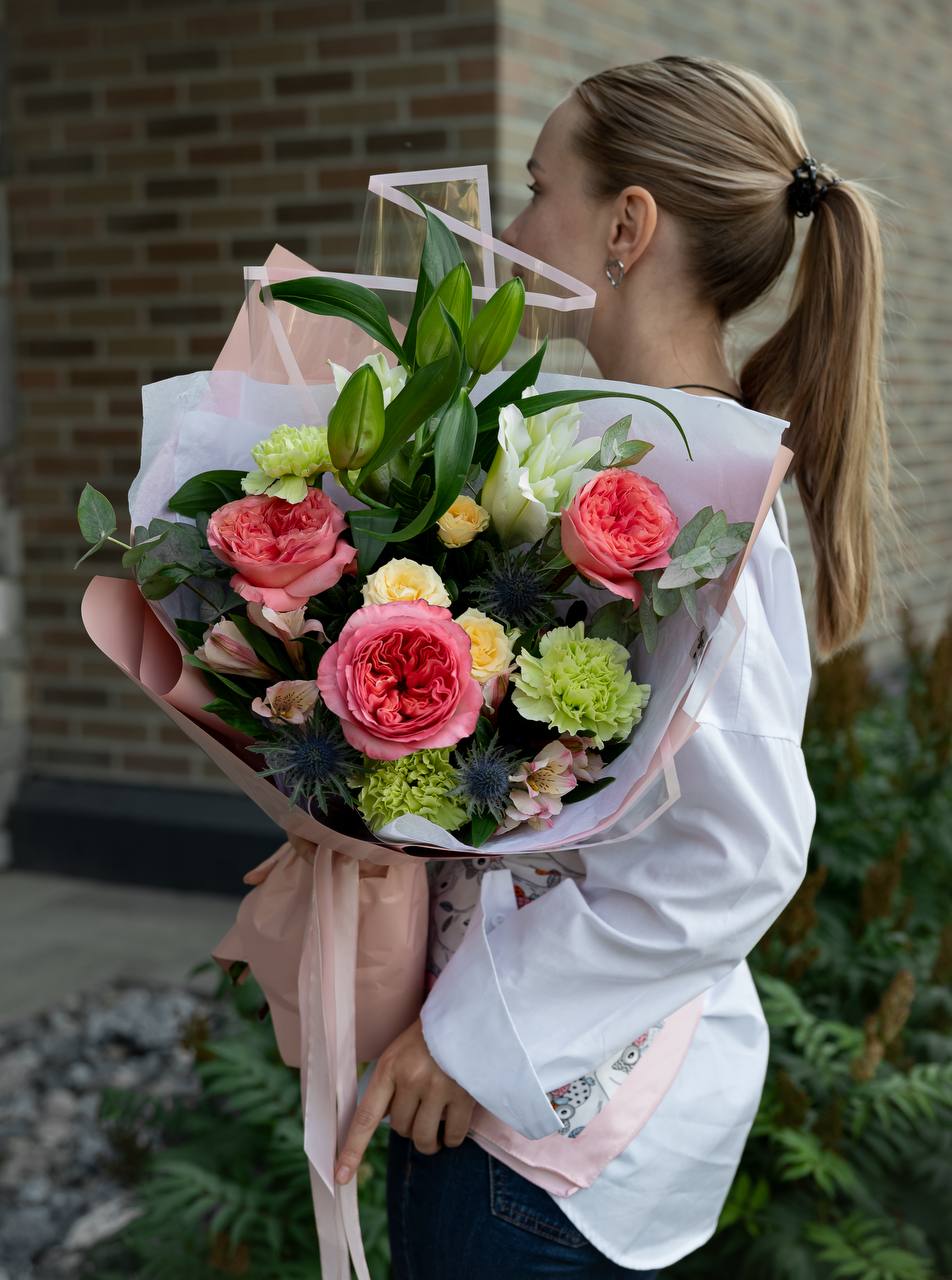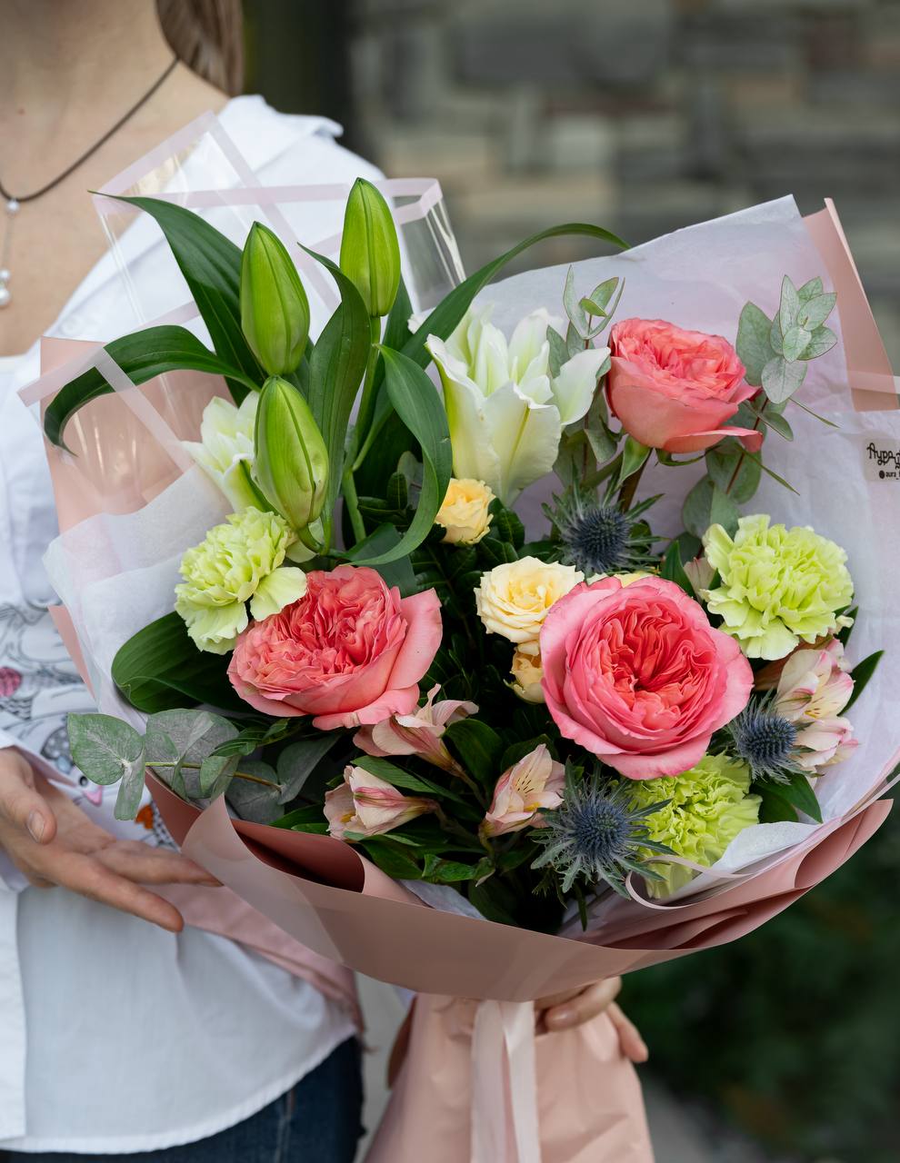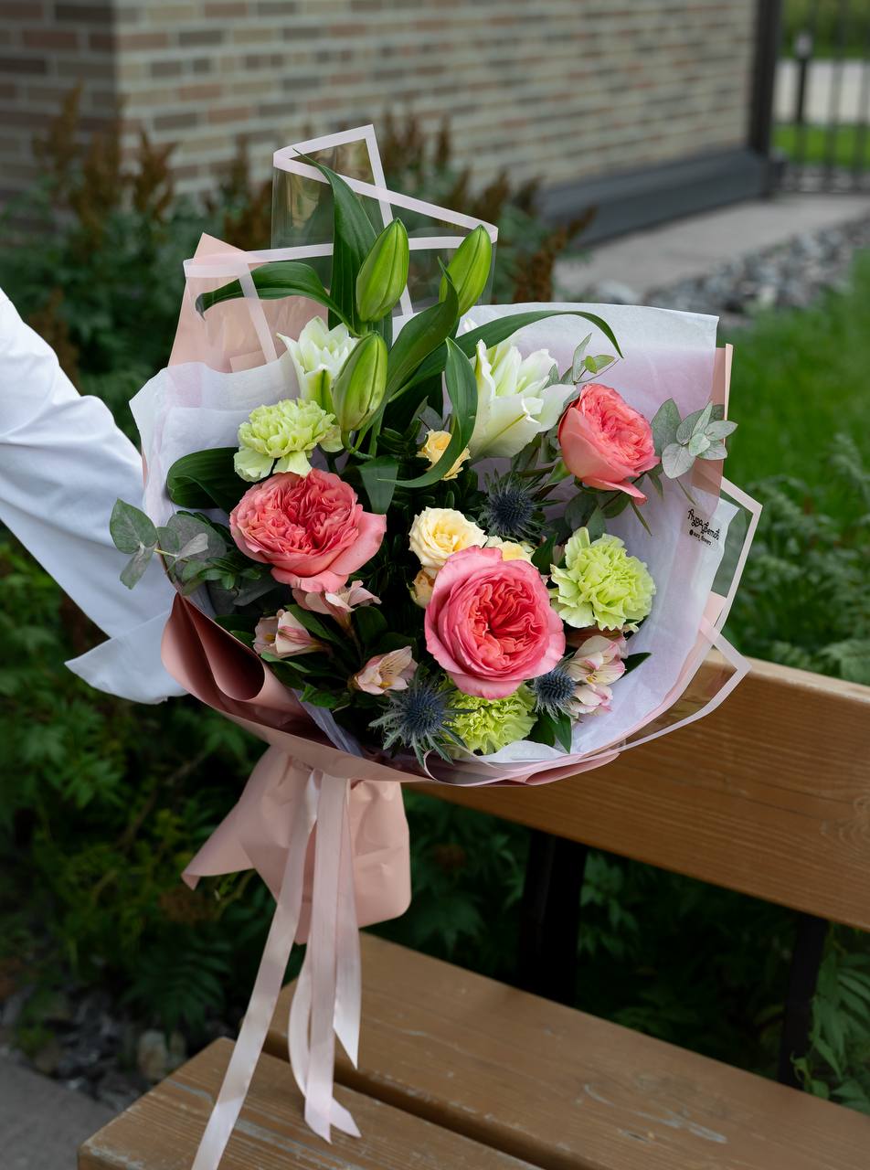 Лилия, роза Эквадор, роза кустовая, гвоздика, альстромерия, зелень, оформление.