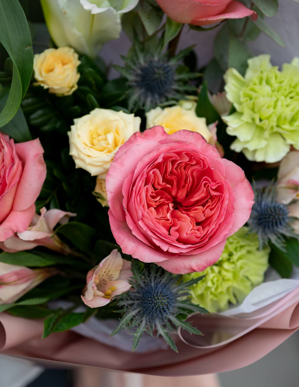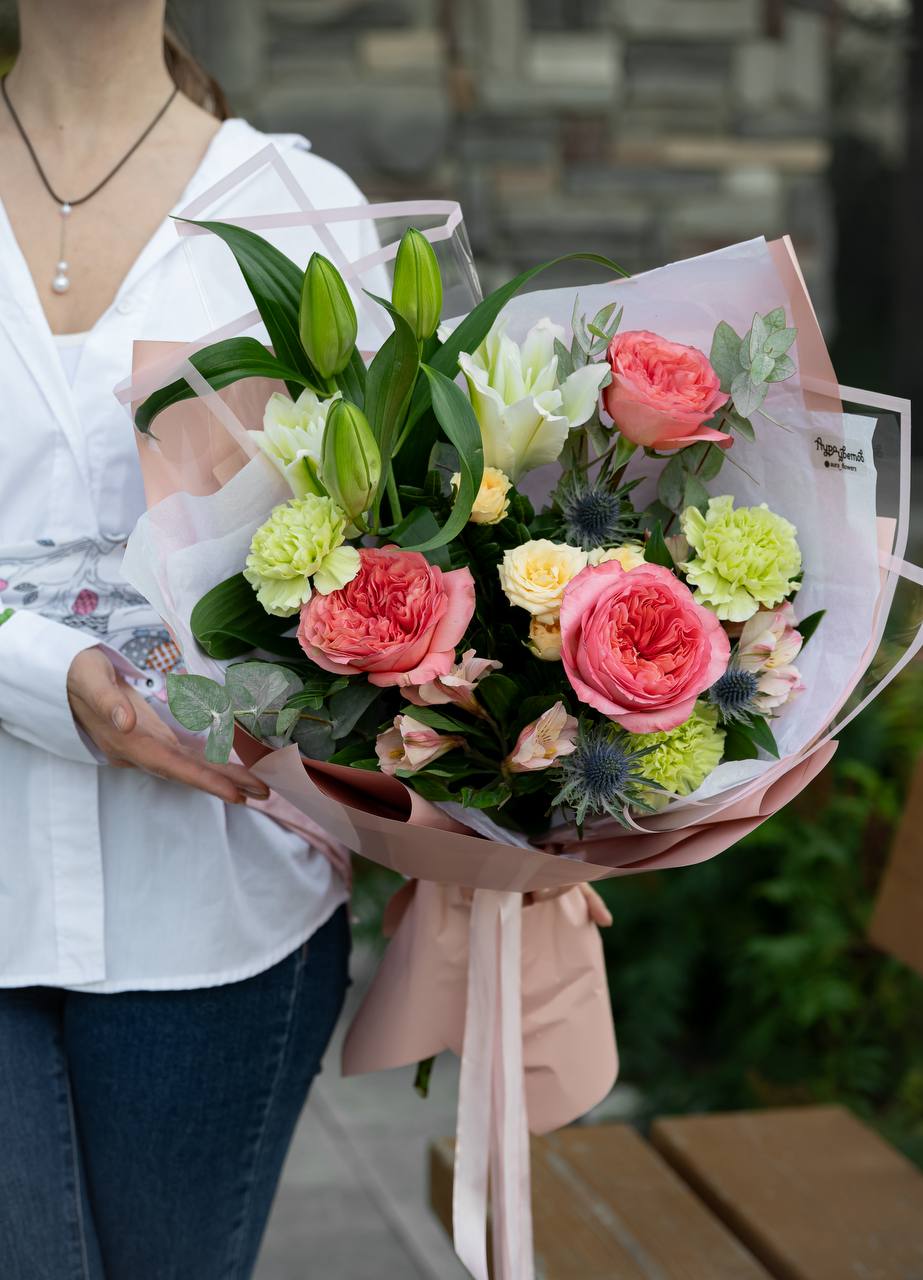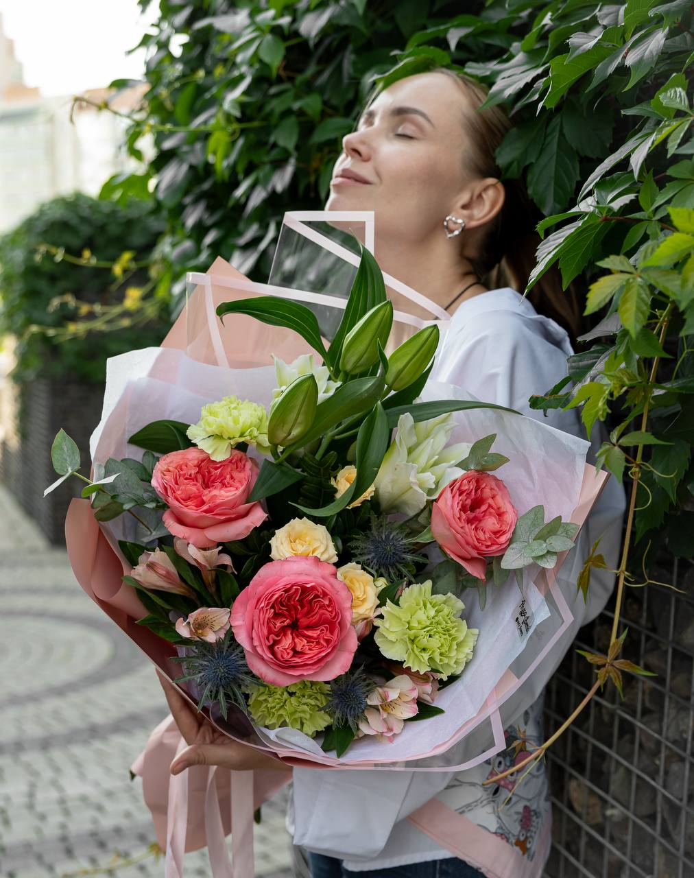 Лилия, роза Эквадор, роза кустовая, гвоздика, альстромерия, зелень, оформление.