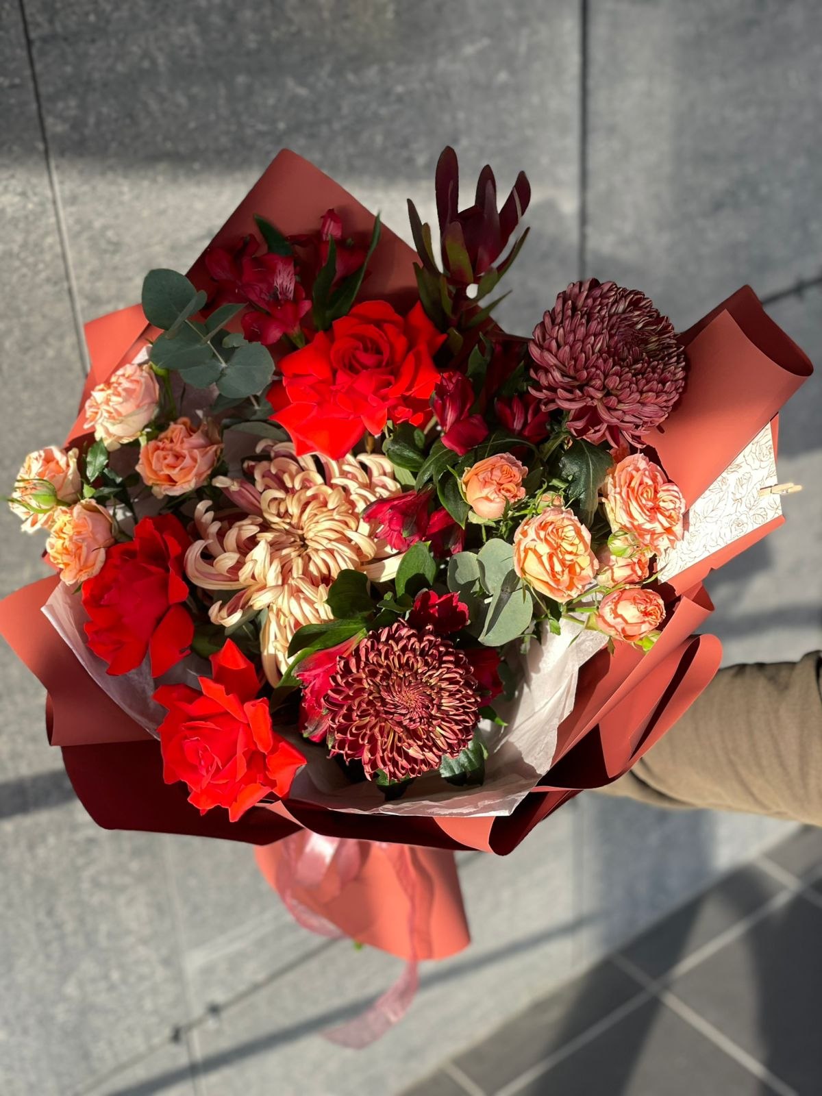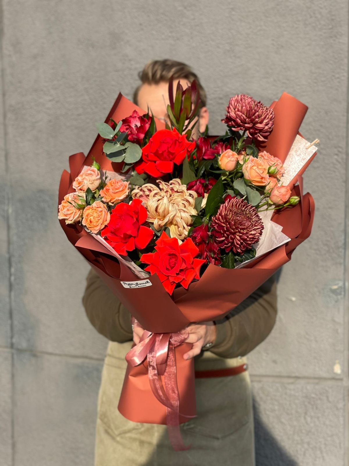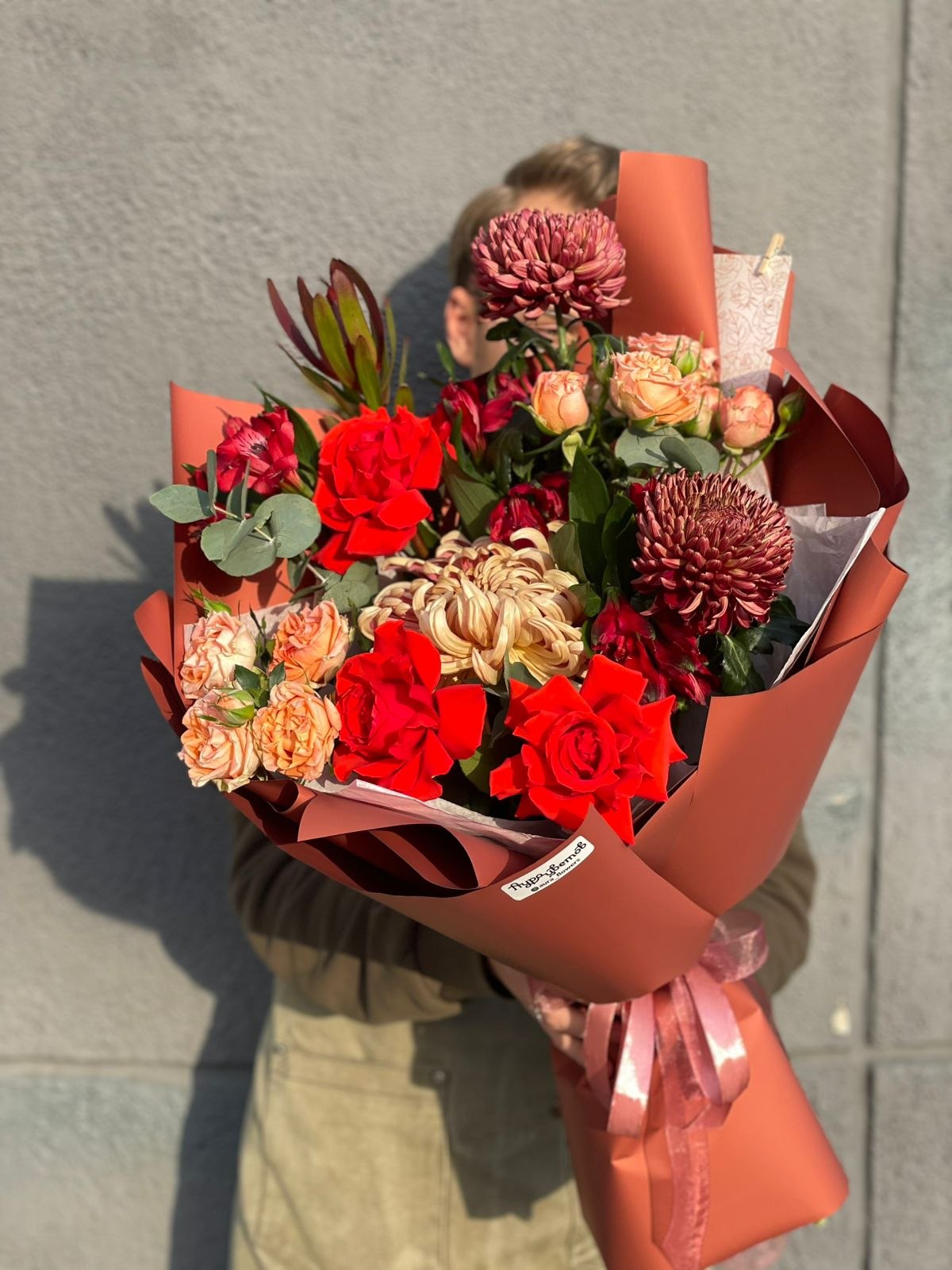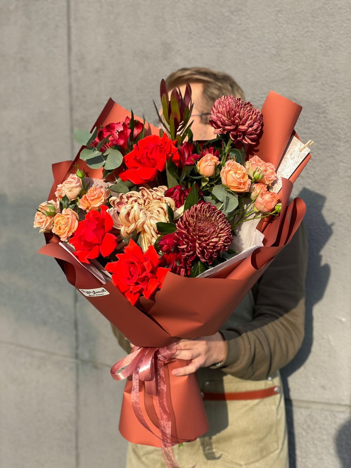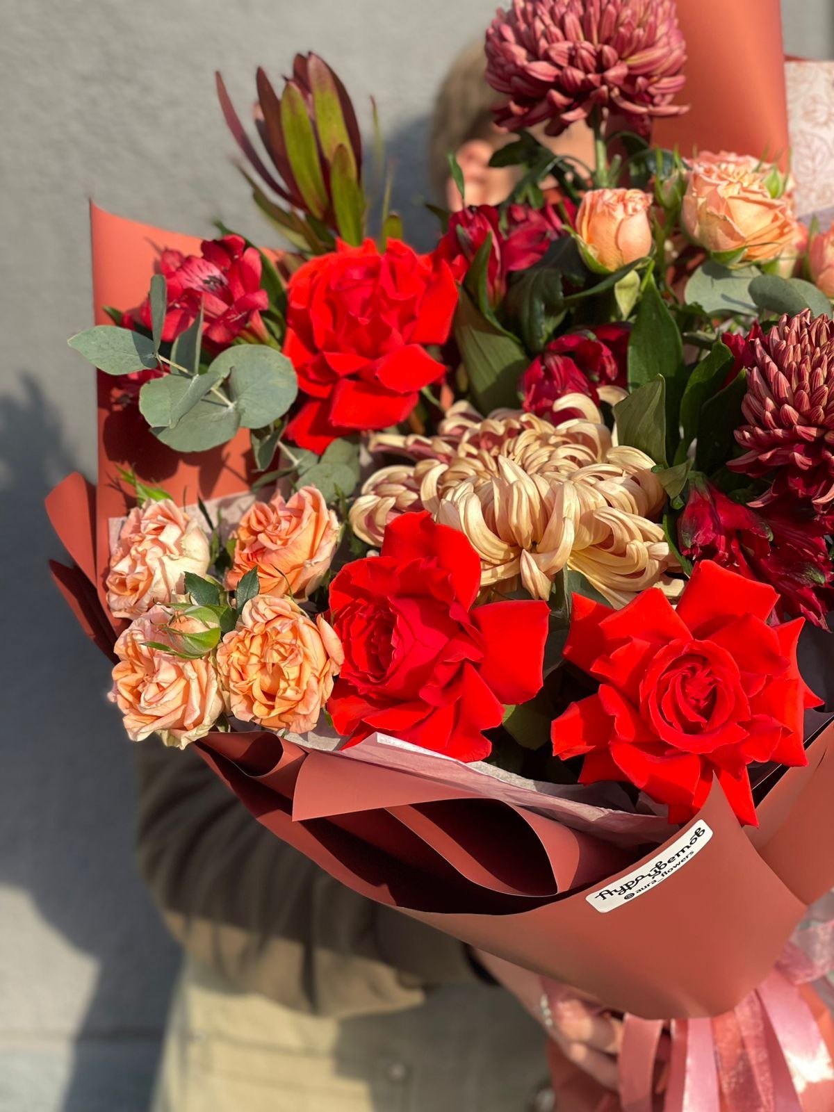 Букет с французским розами и сортовыми хризантемами «Пик осени»