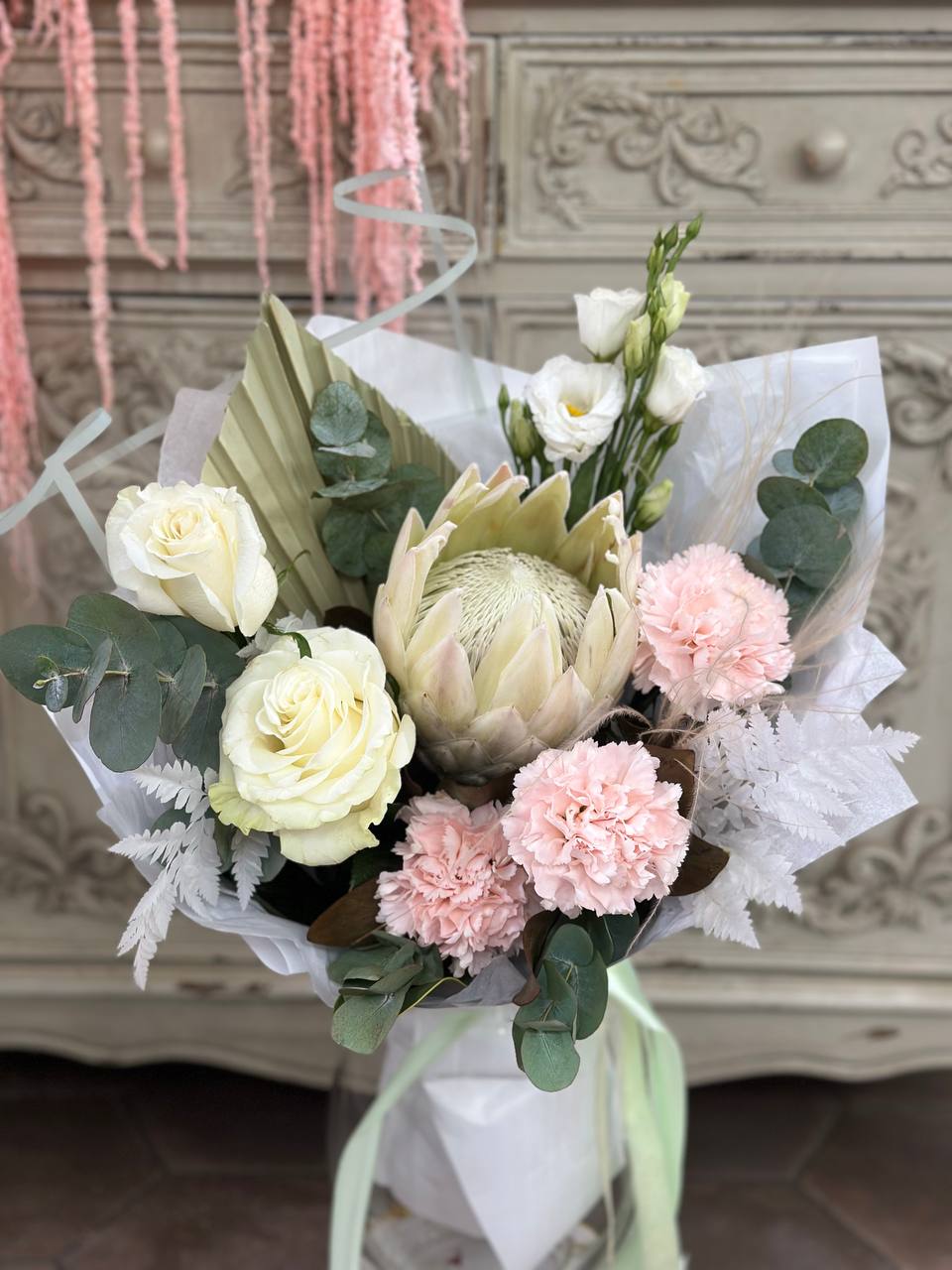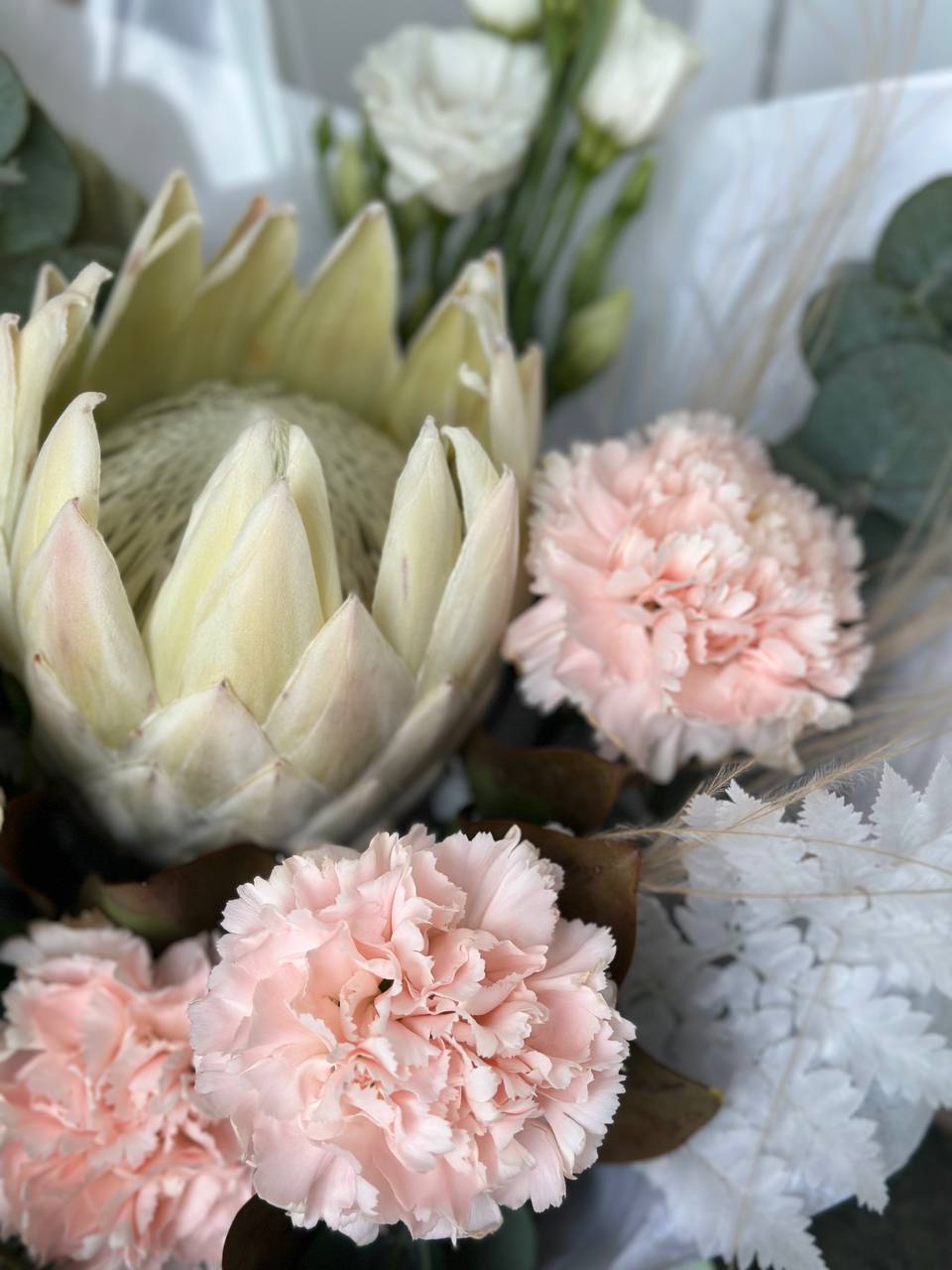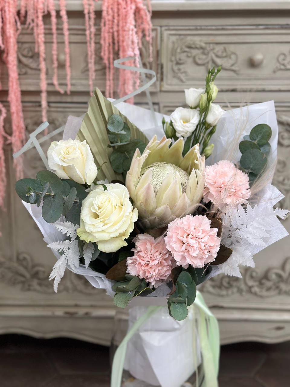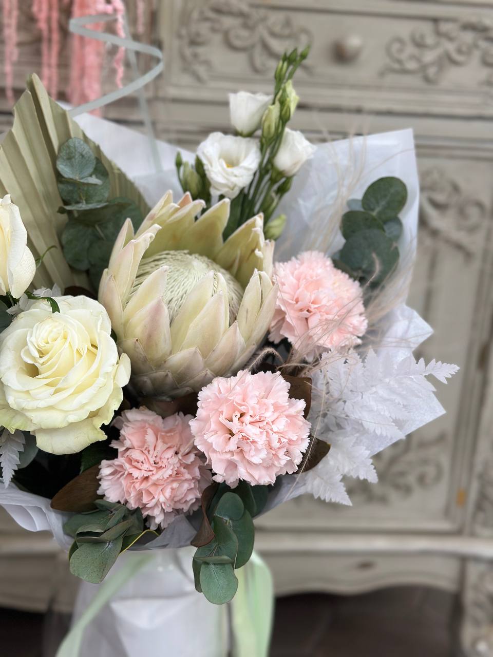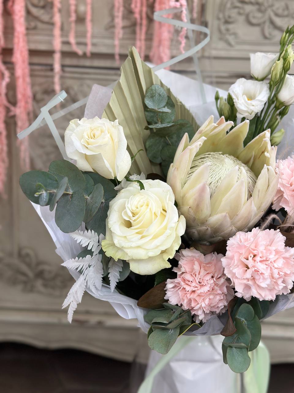 Протея, роза Эквадор, диантус, эустома, зелень, сухоцветы, оформление.