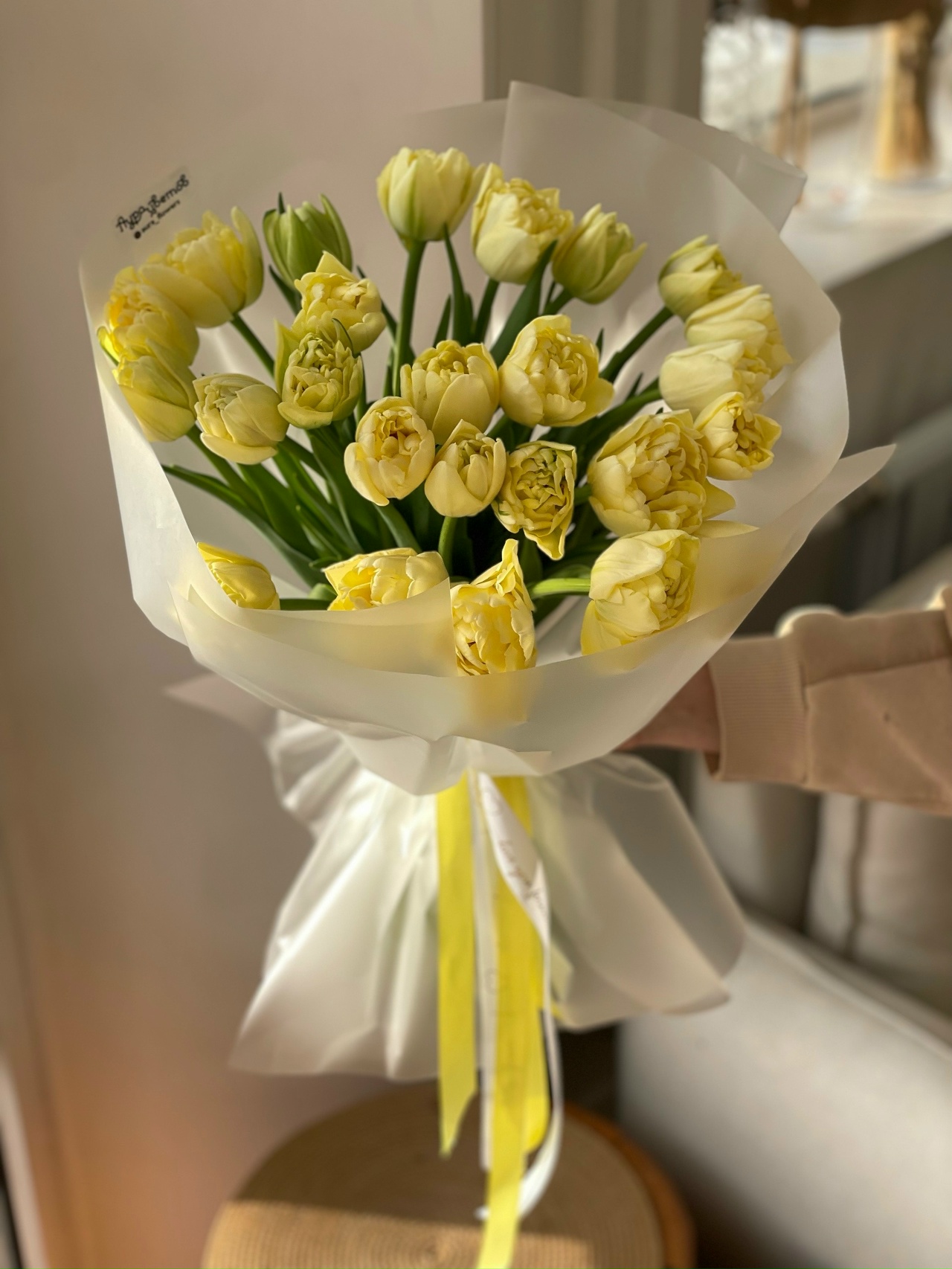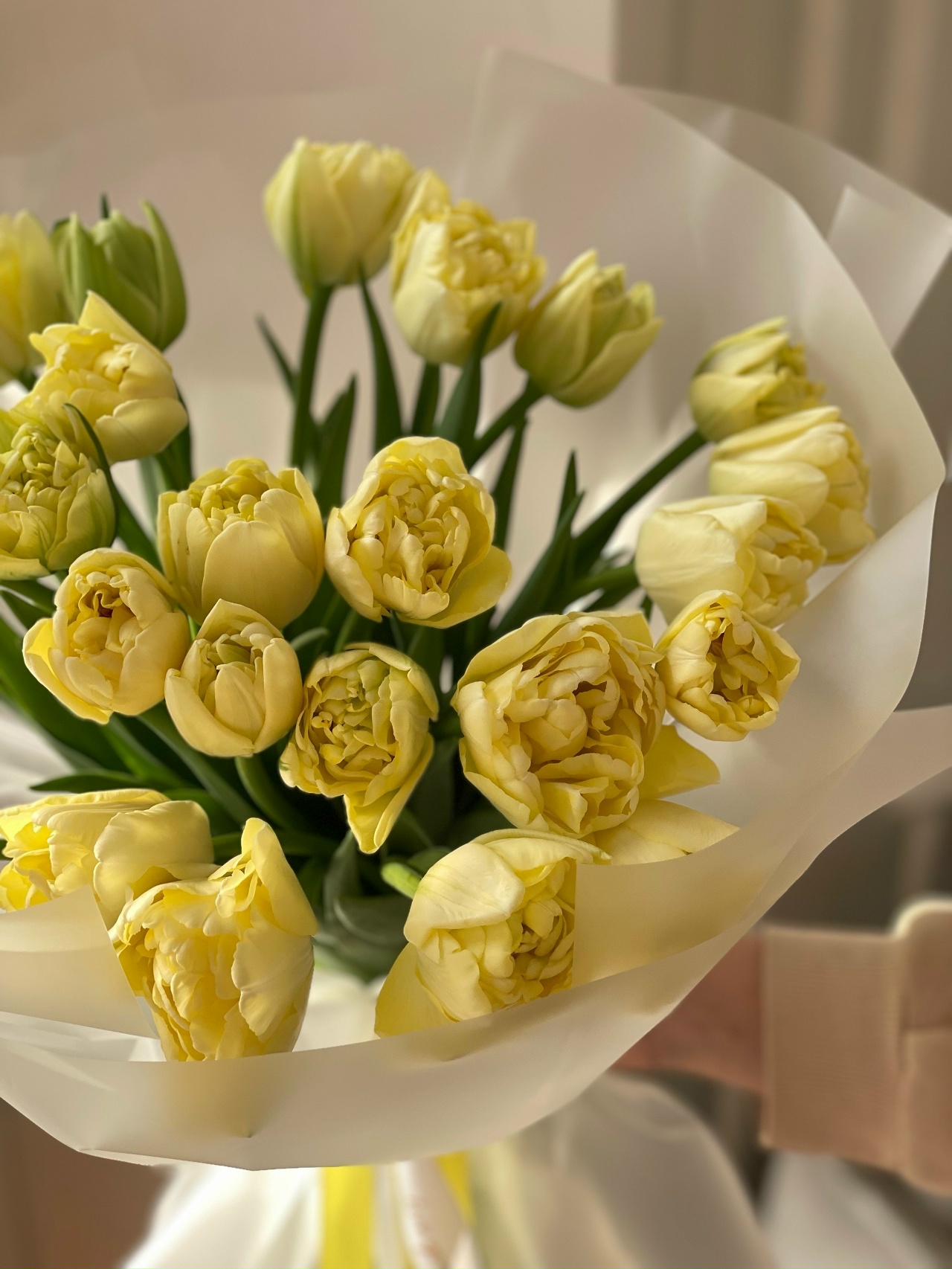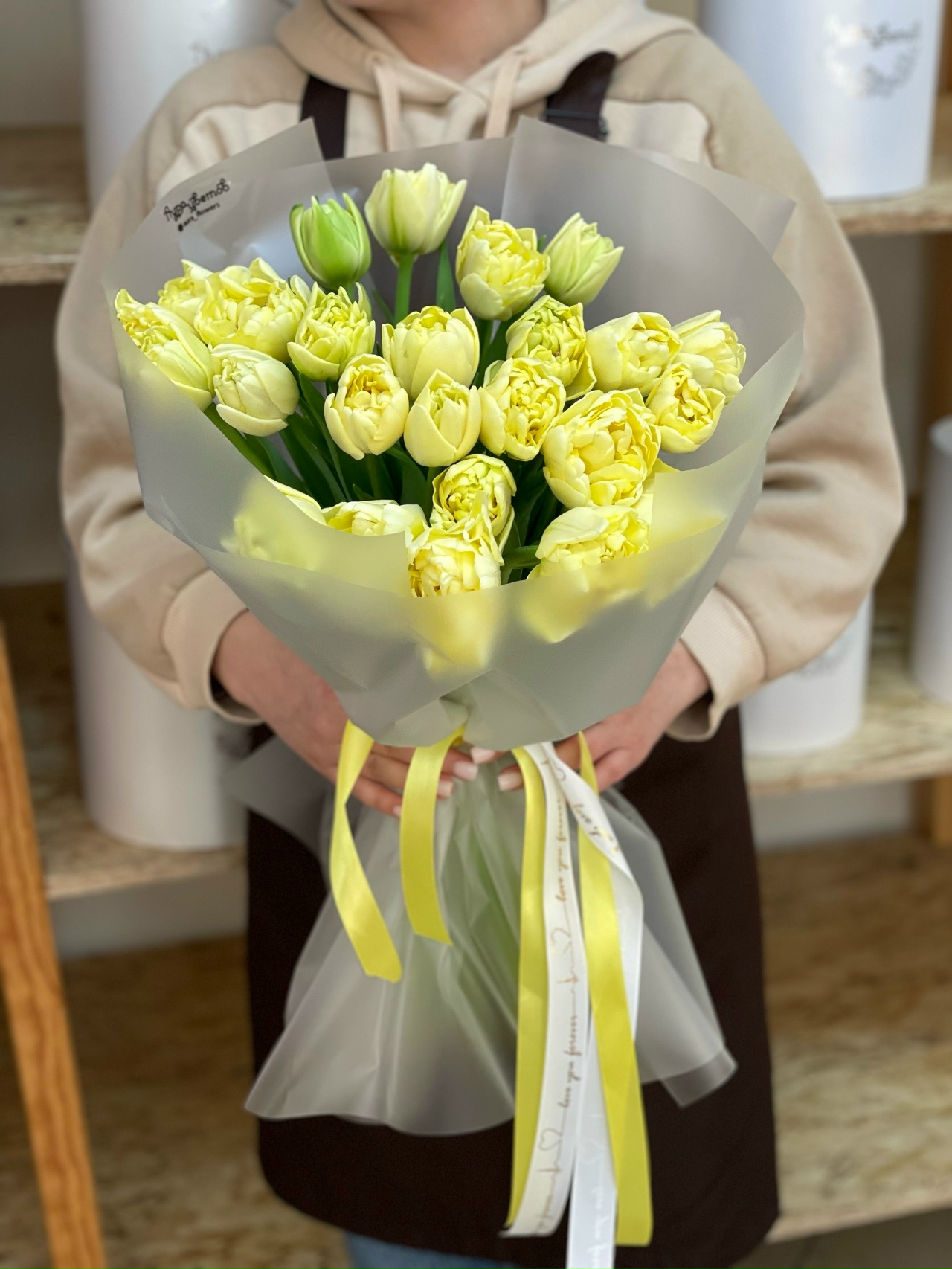 Букет из 25 пионовидных лимонных тюльпанов