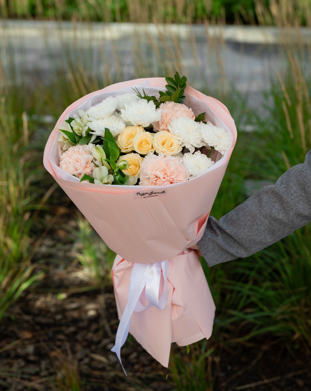 Кустовая роза, кустовая хризантема,гвоздики, альстромерия, зелень, оформление.