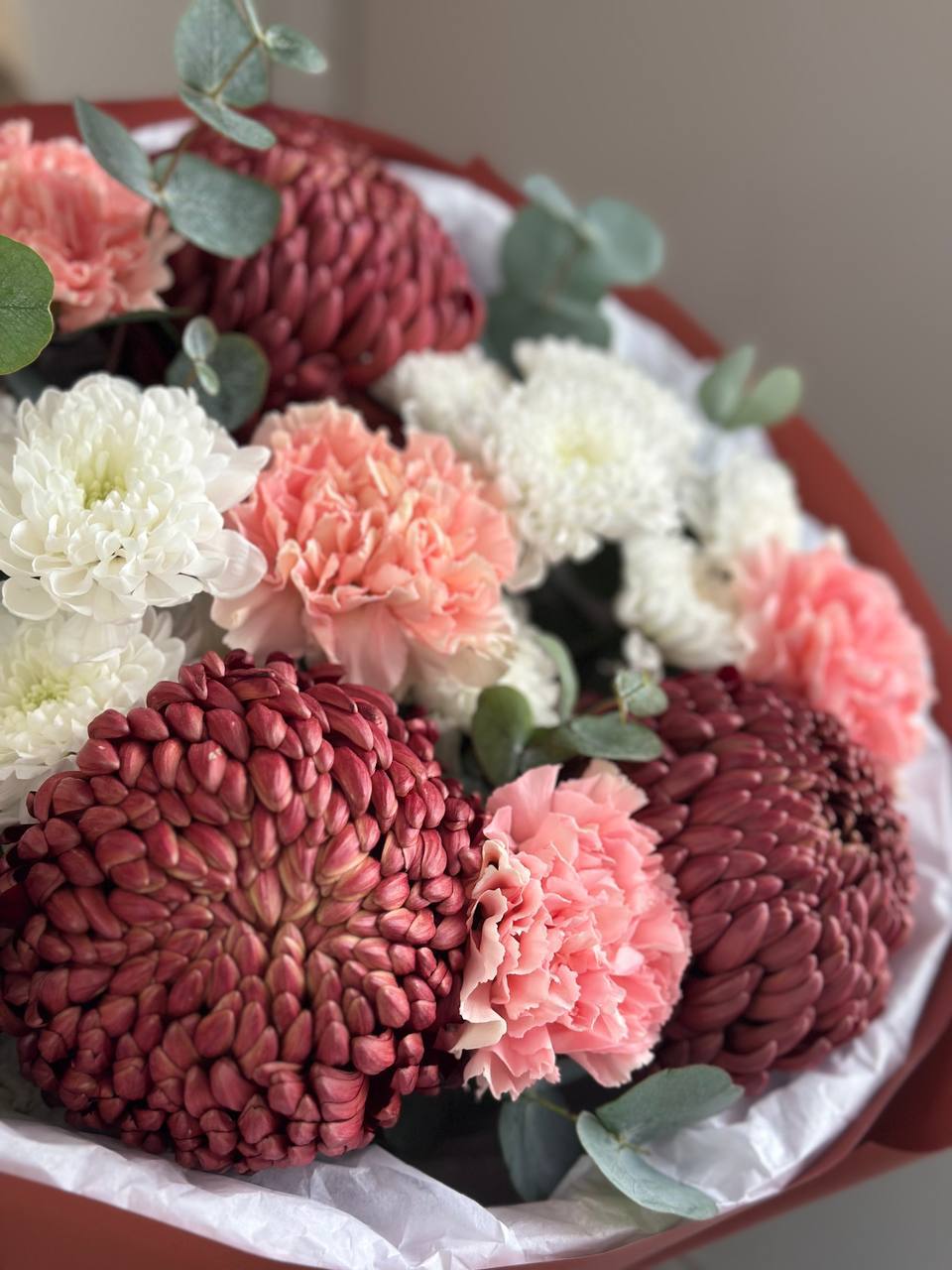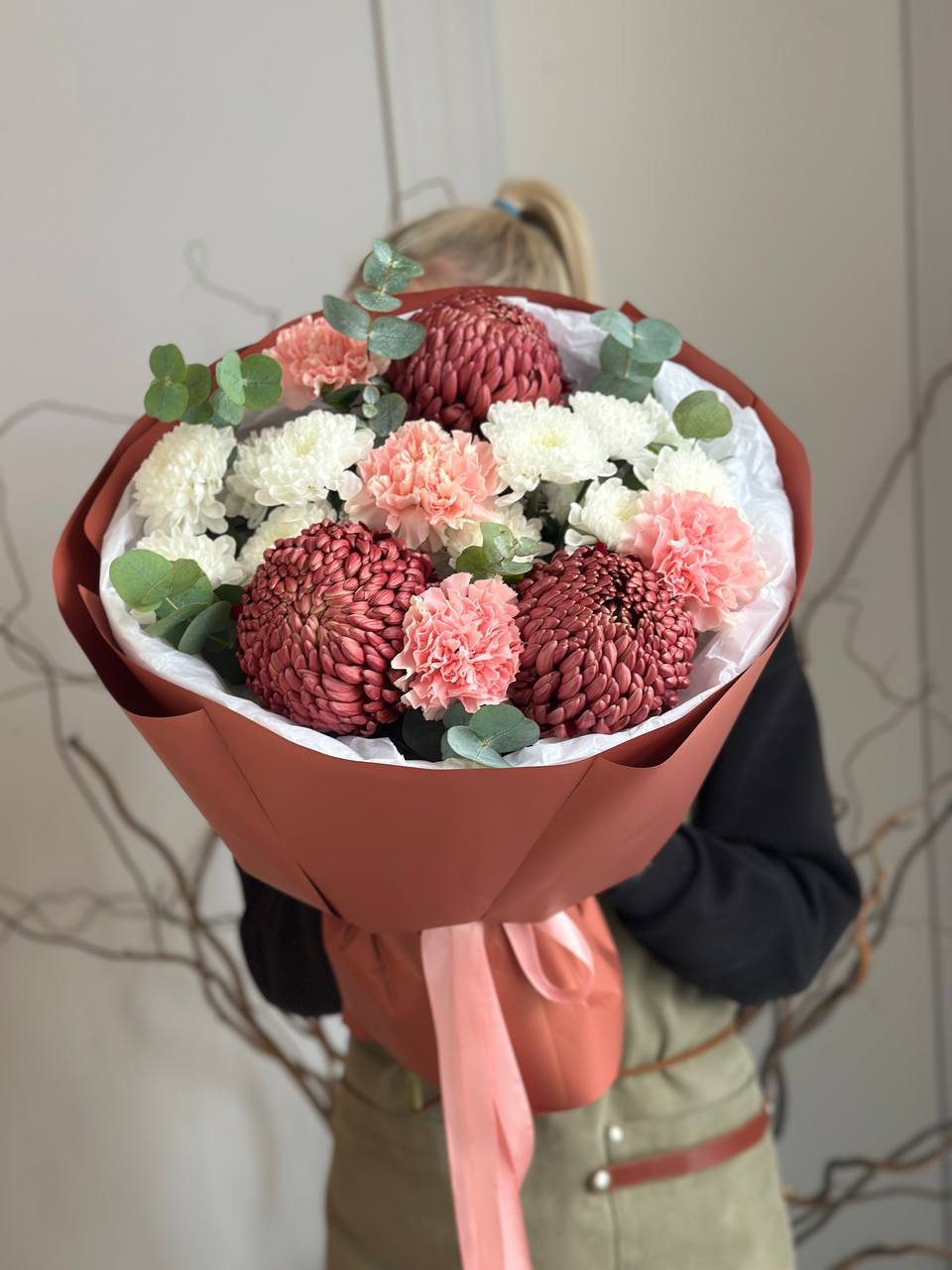 Гвоздика, хризантема Бигуди (сезон), хризантема кустовая, эвкалипт, оформление.