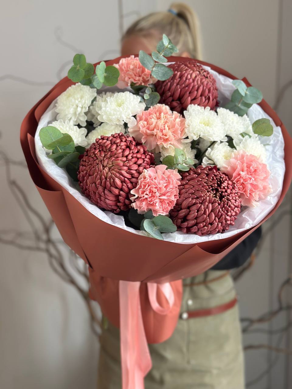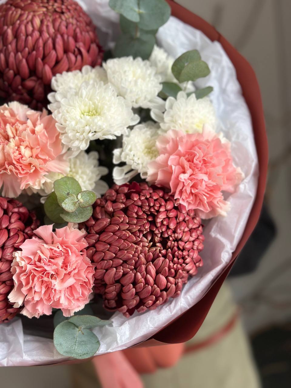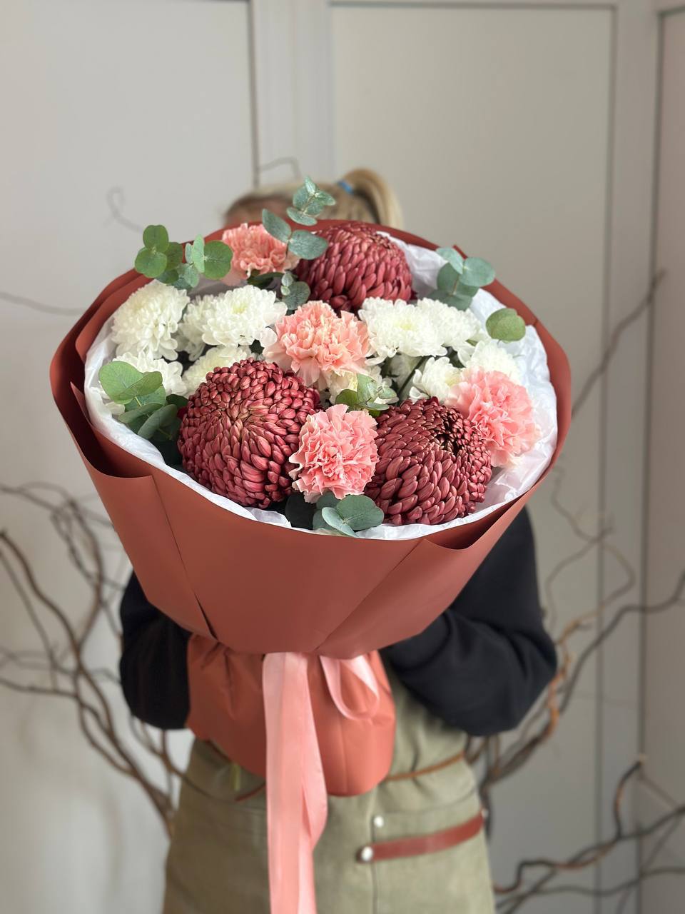 Букет с хризантемами и гвоздиками "Цветочное объятие" ко Дню мамы