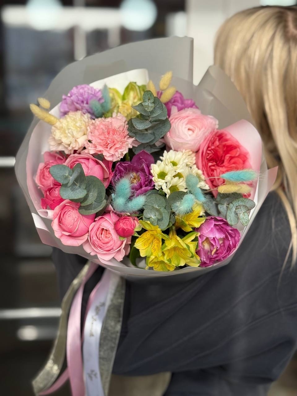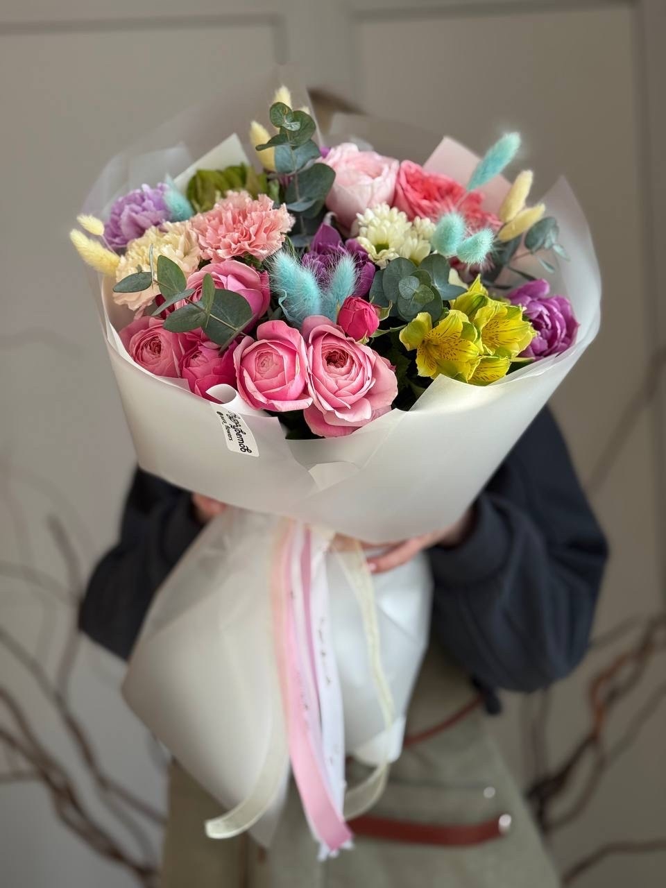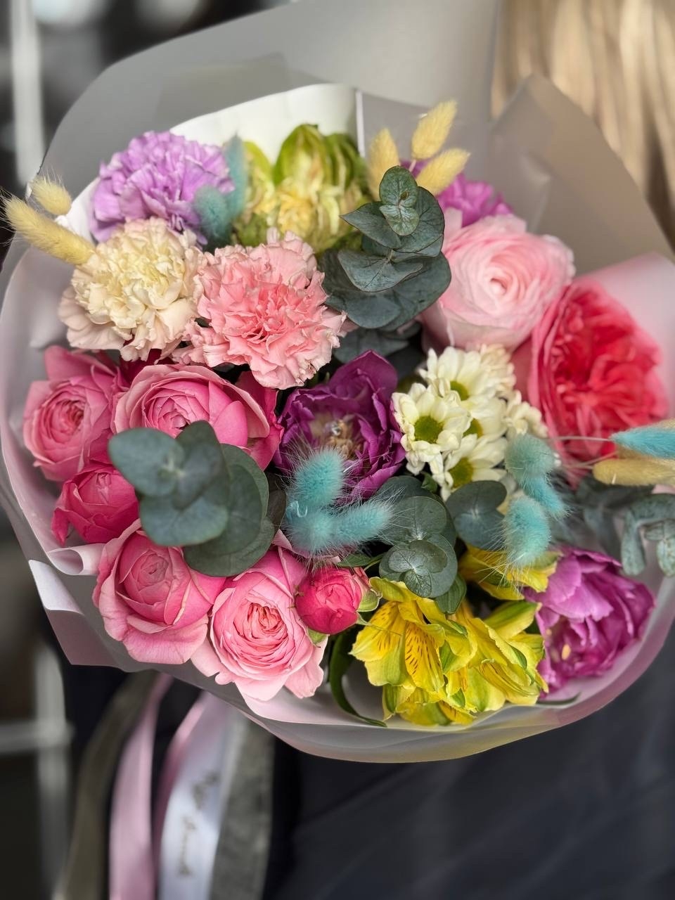 Гвоздика, альстромерия, роза кустовая, роза Эквадор, зелень, тюльпан, лютик, сухоцветы, оформление.