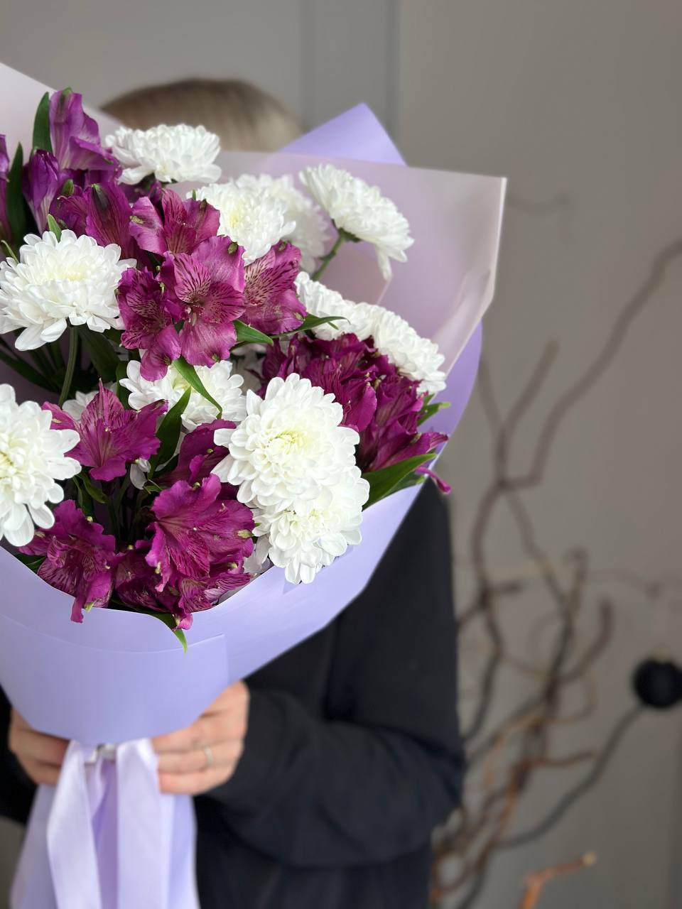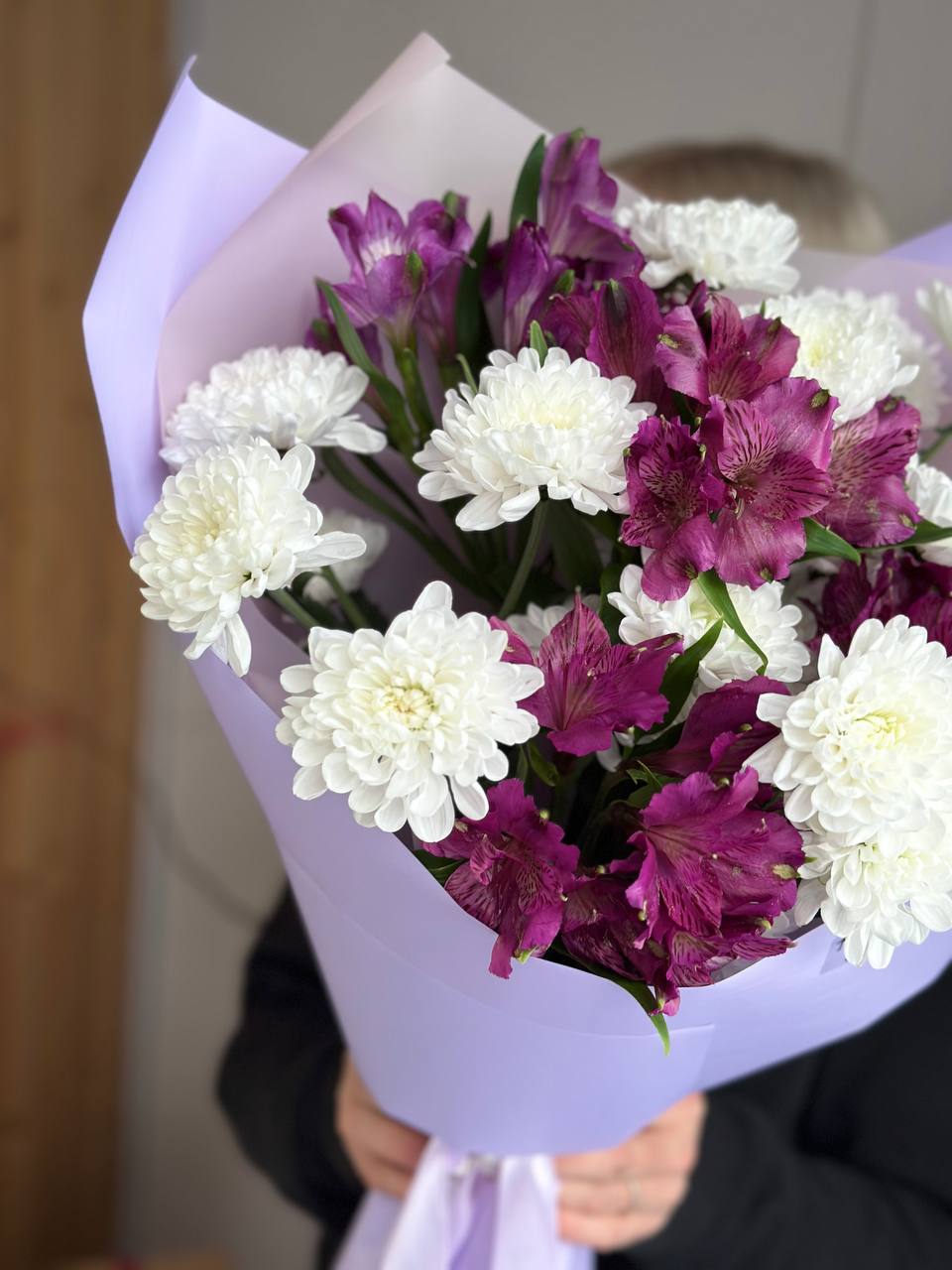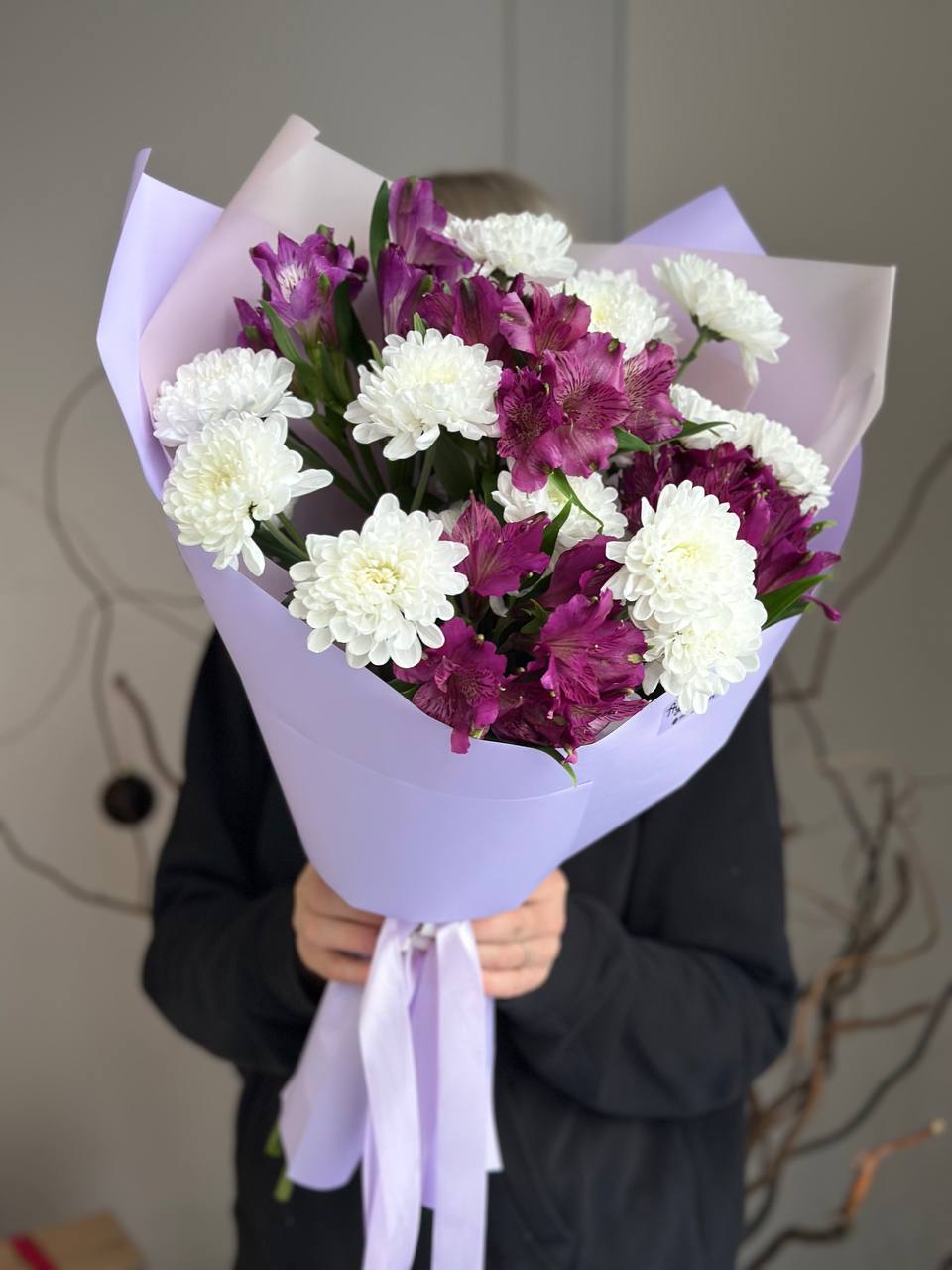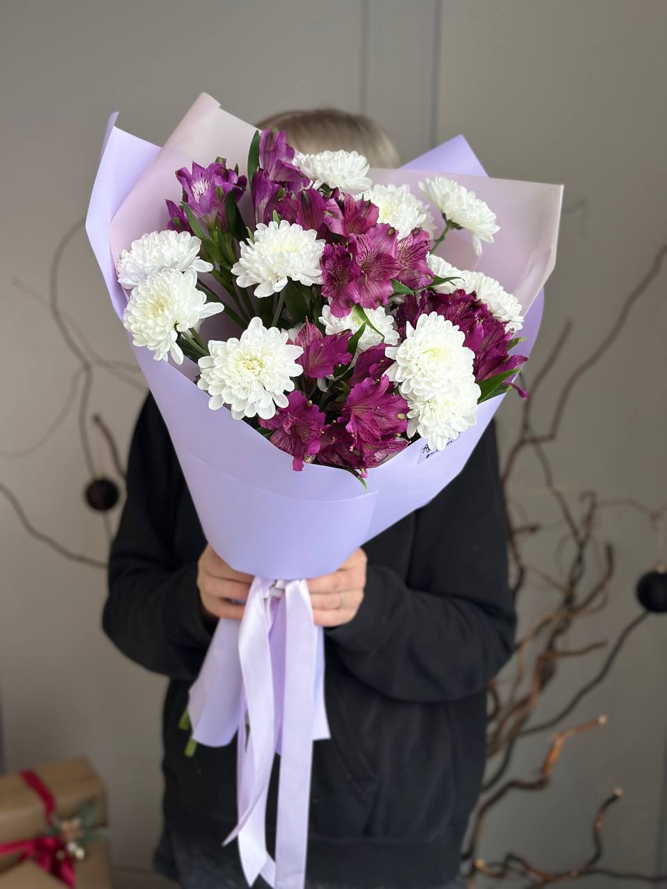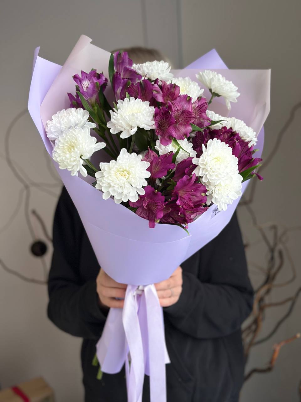 Хризантема кустовая, альстромерия, упаковка дизайнерская.