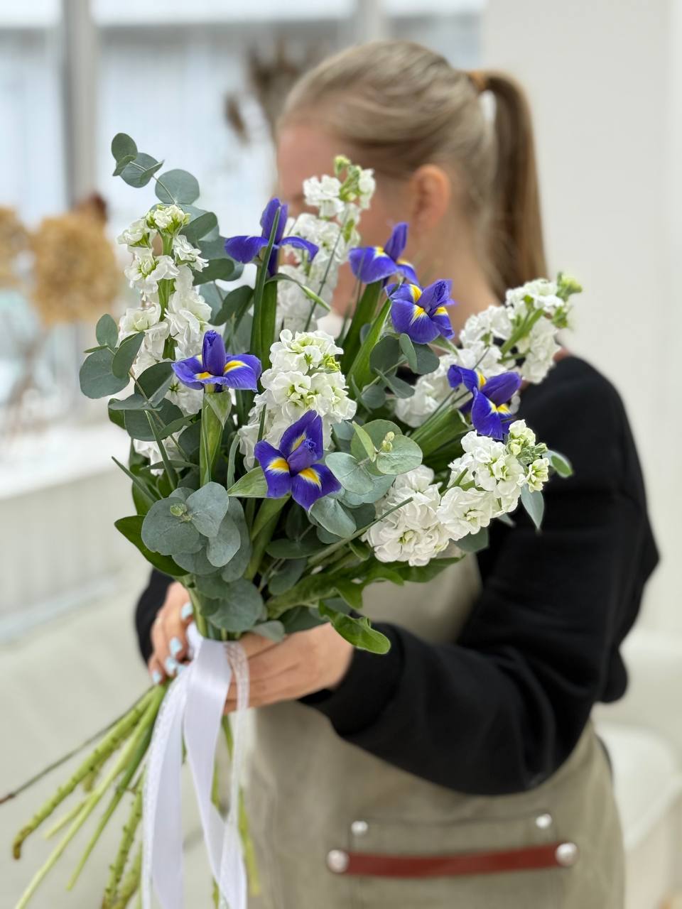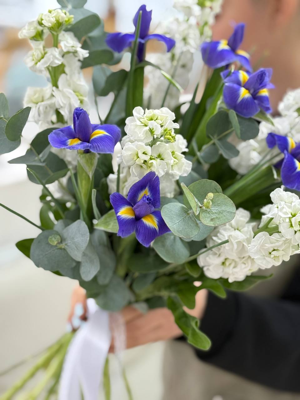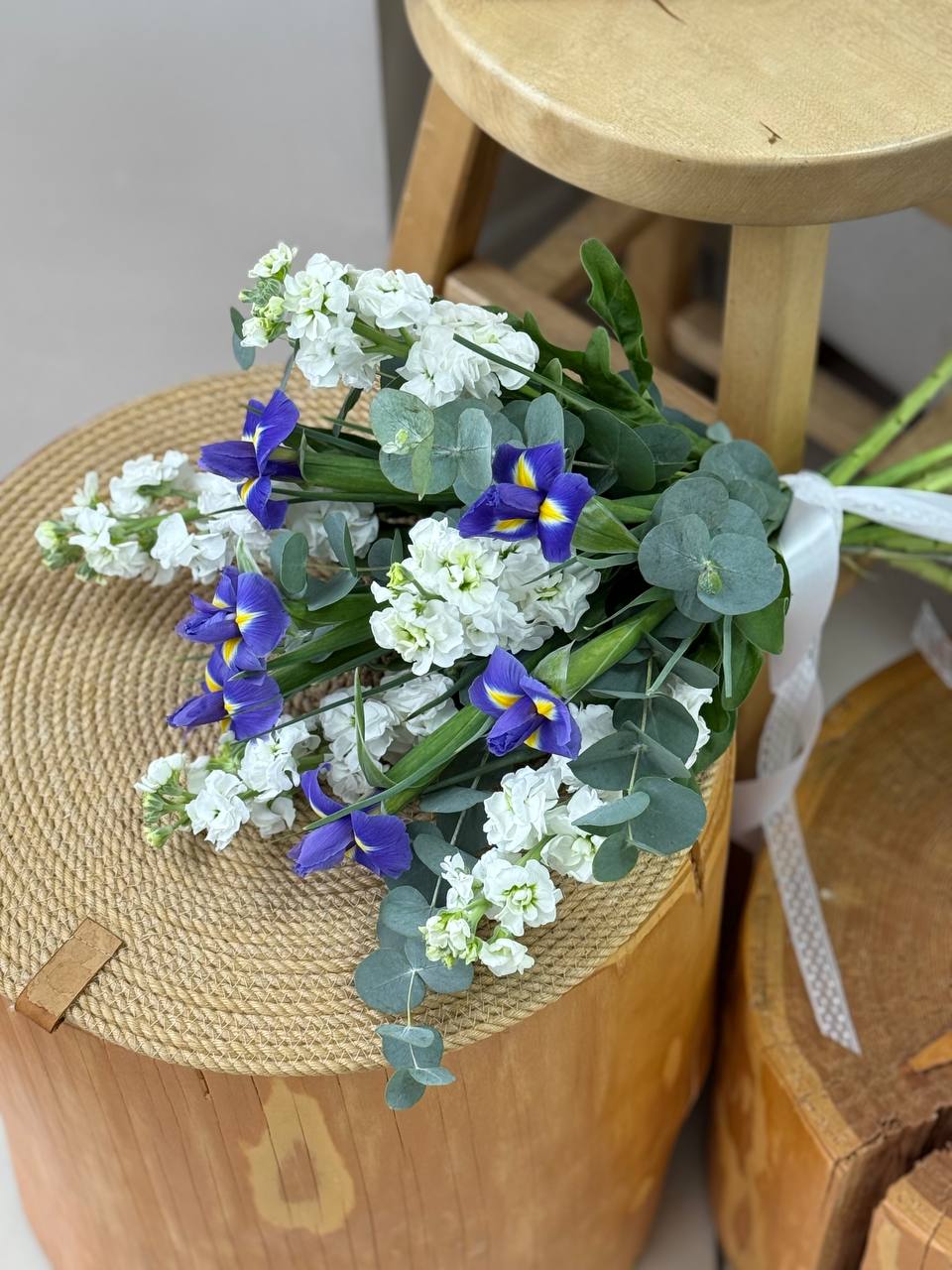 Ирисы, маттиола, лента, зелень.