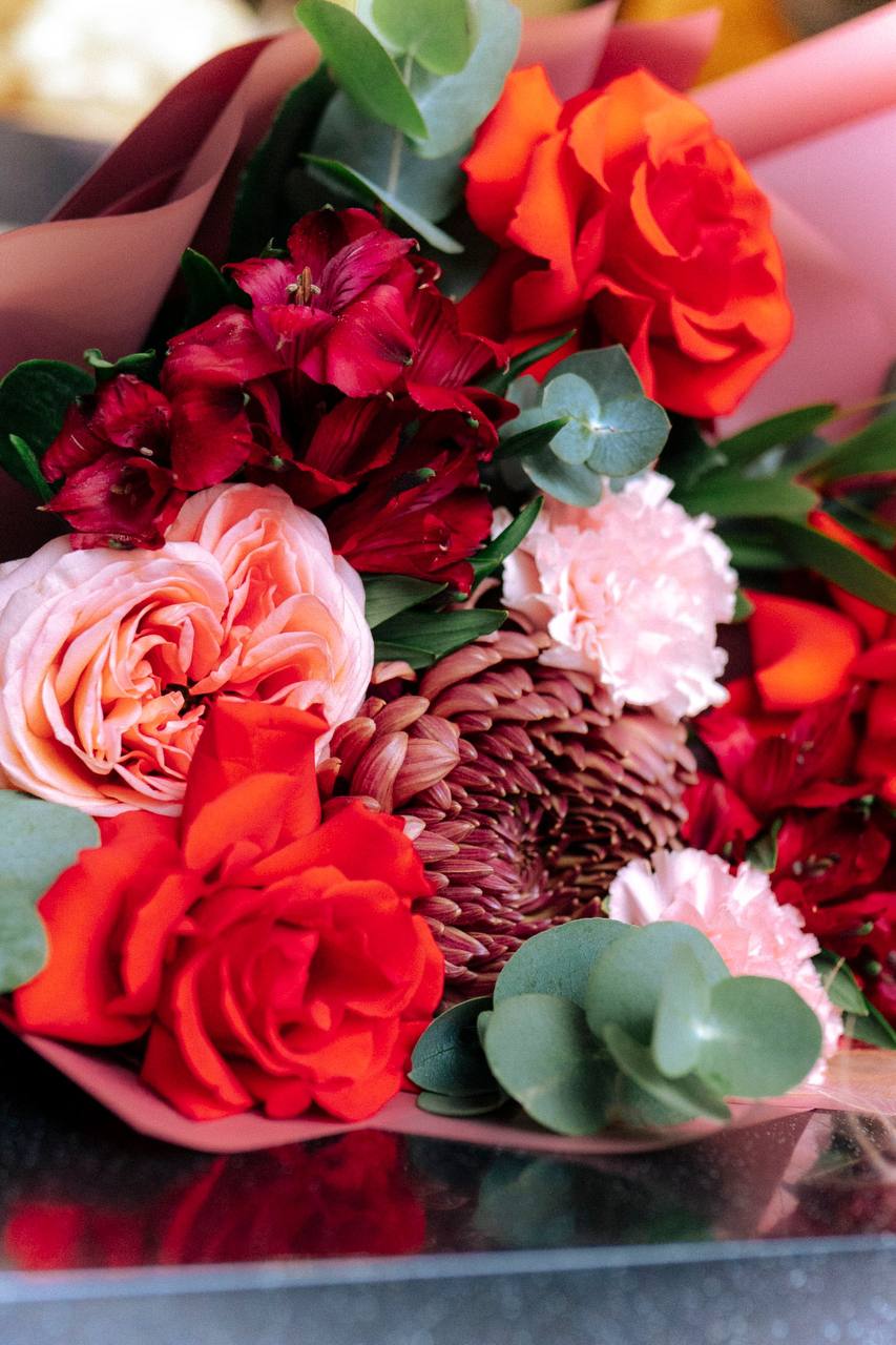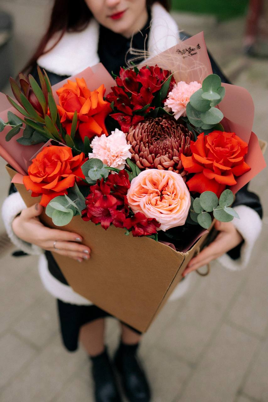 Роза Эквадор, хризантема «Бигуди», диантус, альстромерия, леукодендрон, зелень , оформление.