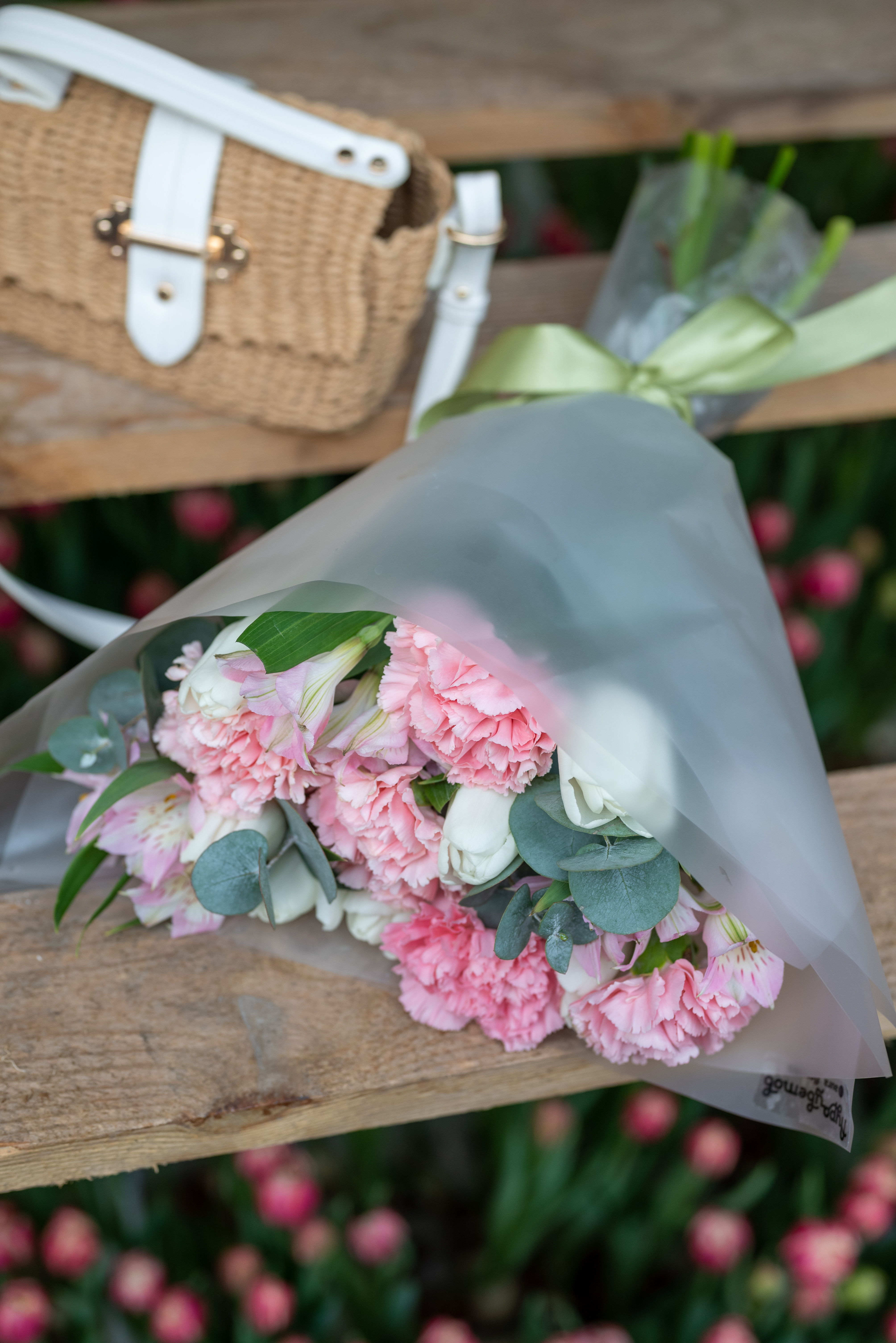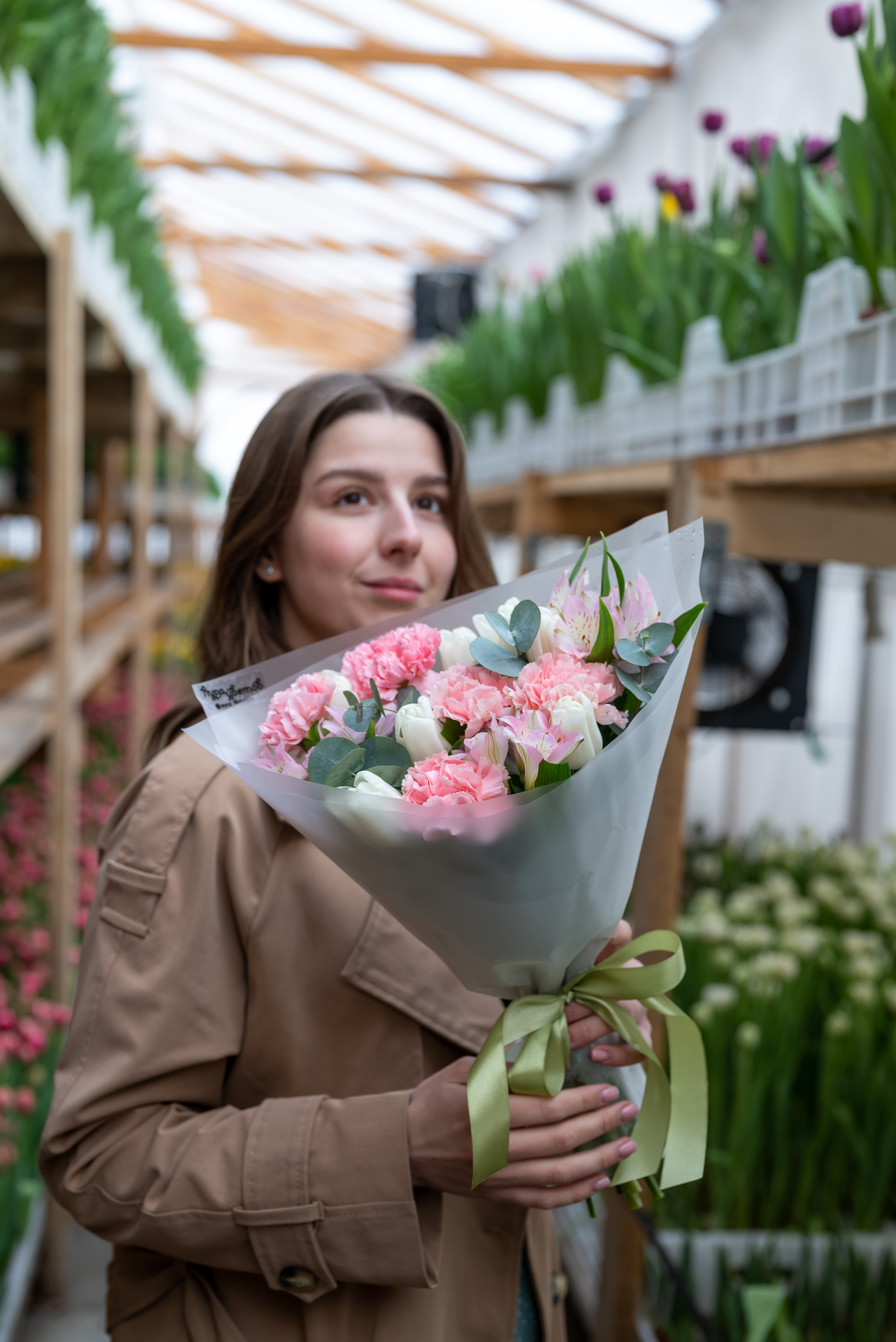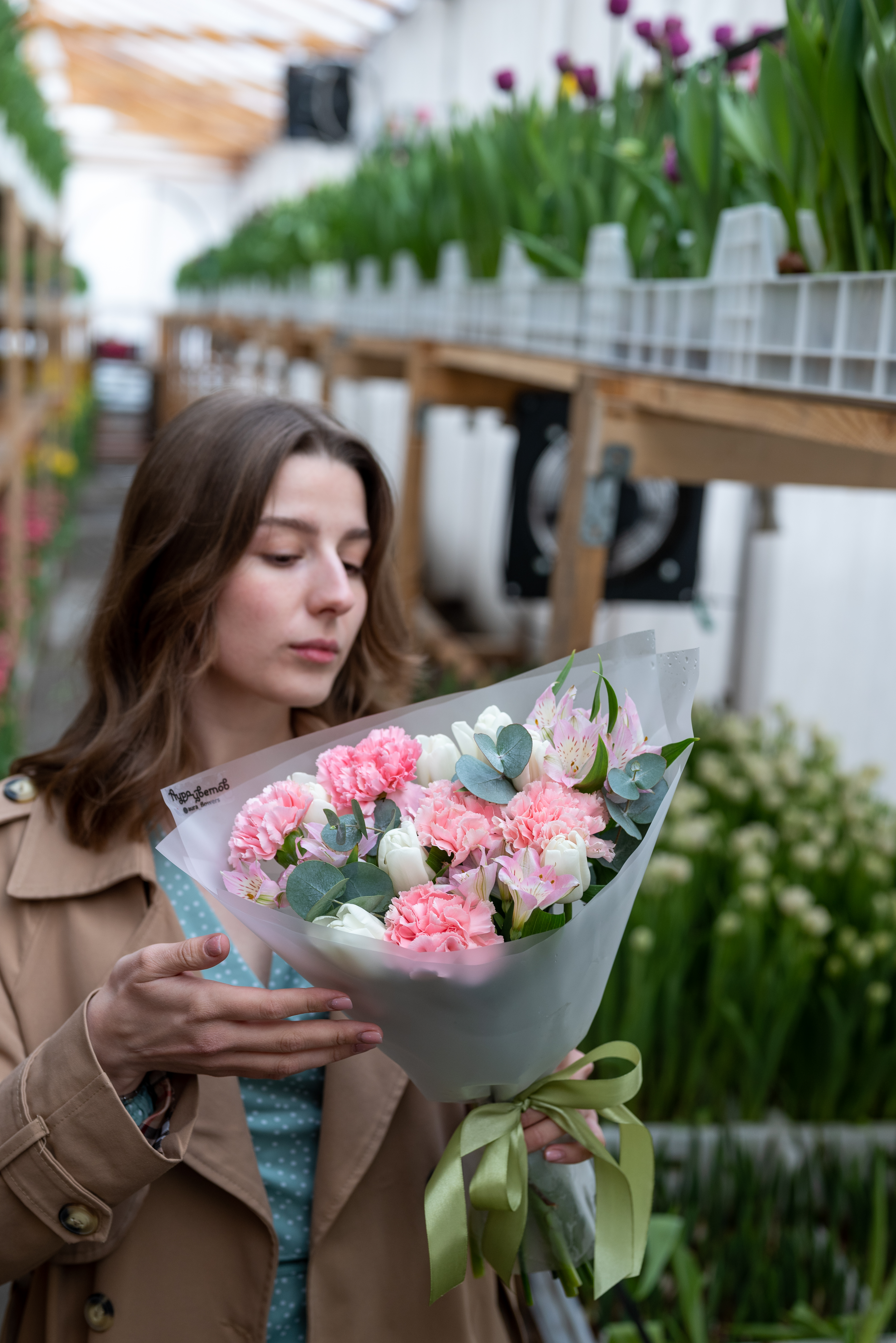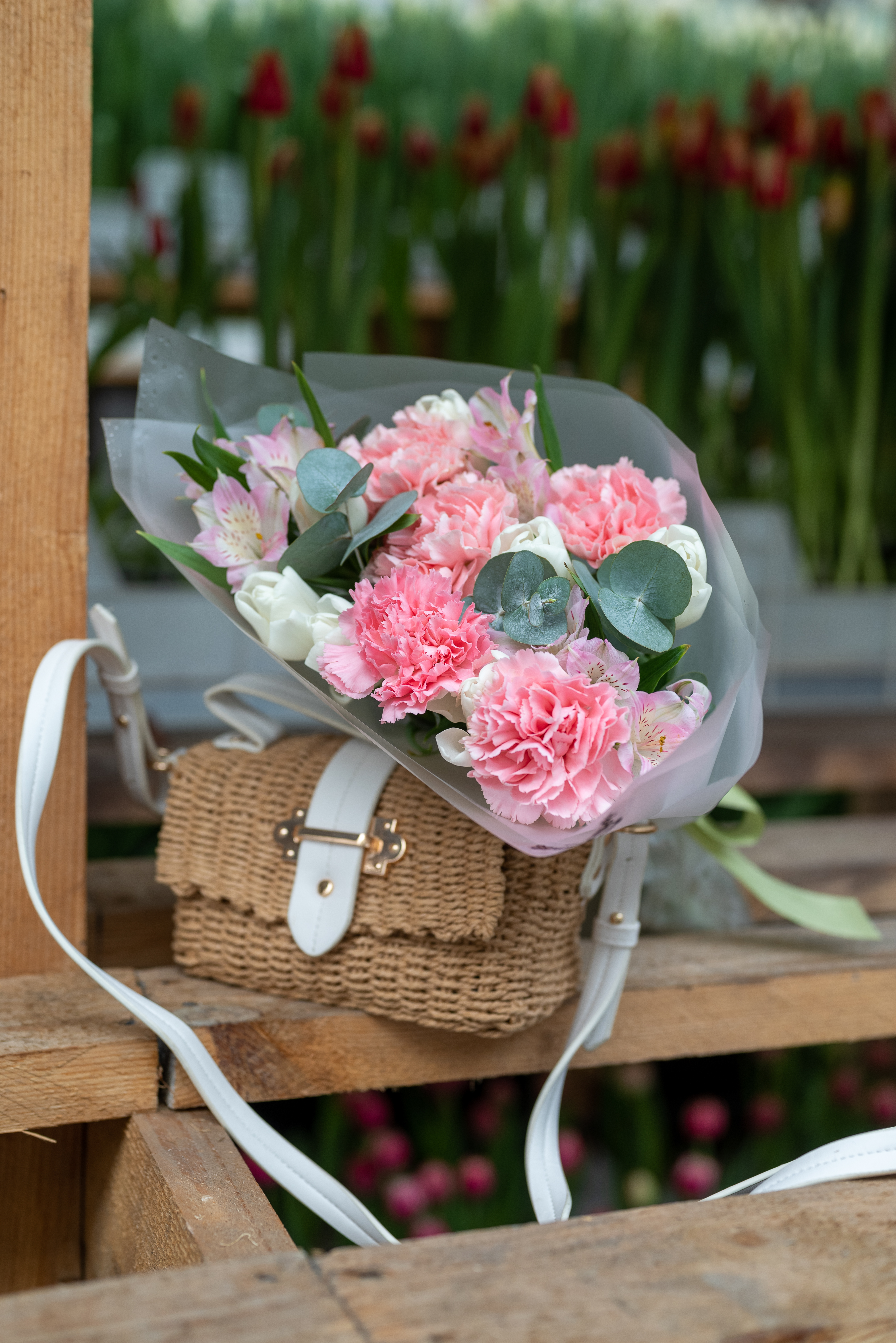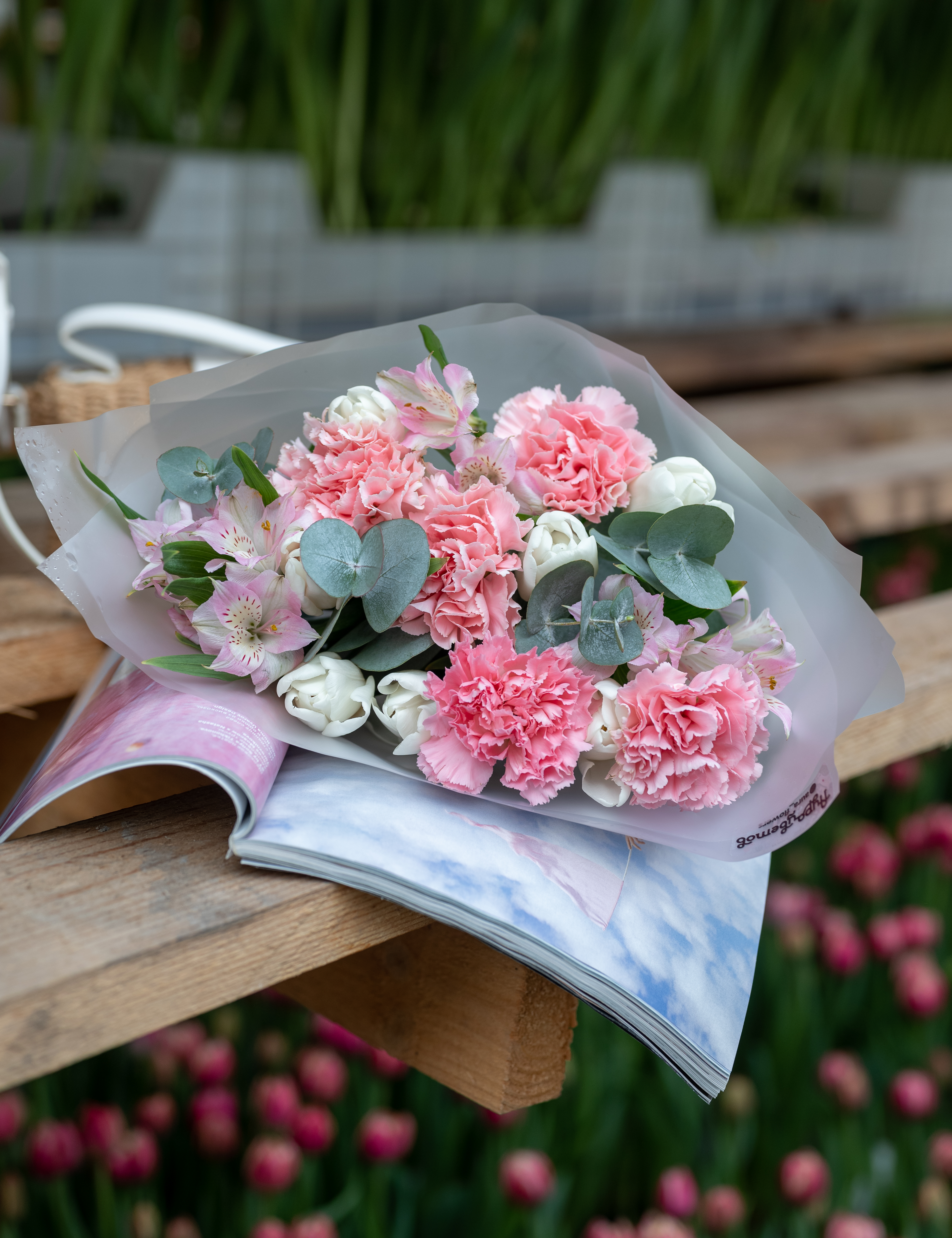Тюльран, альстромерия, гвоздика, эвкалипт, оформление.