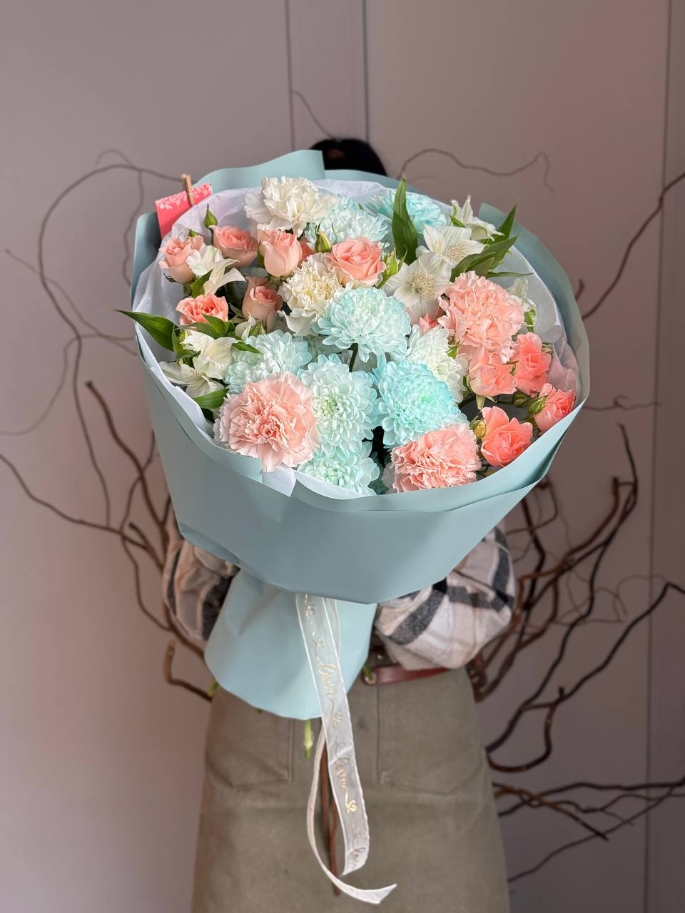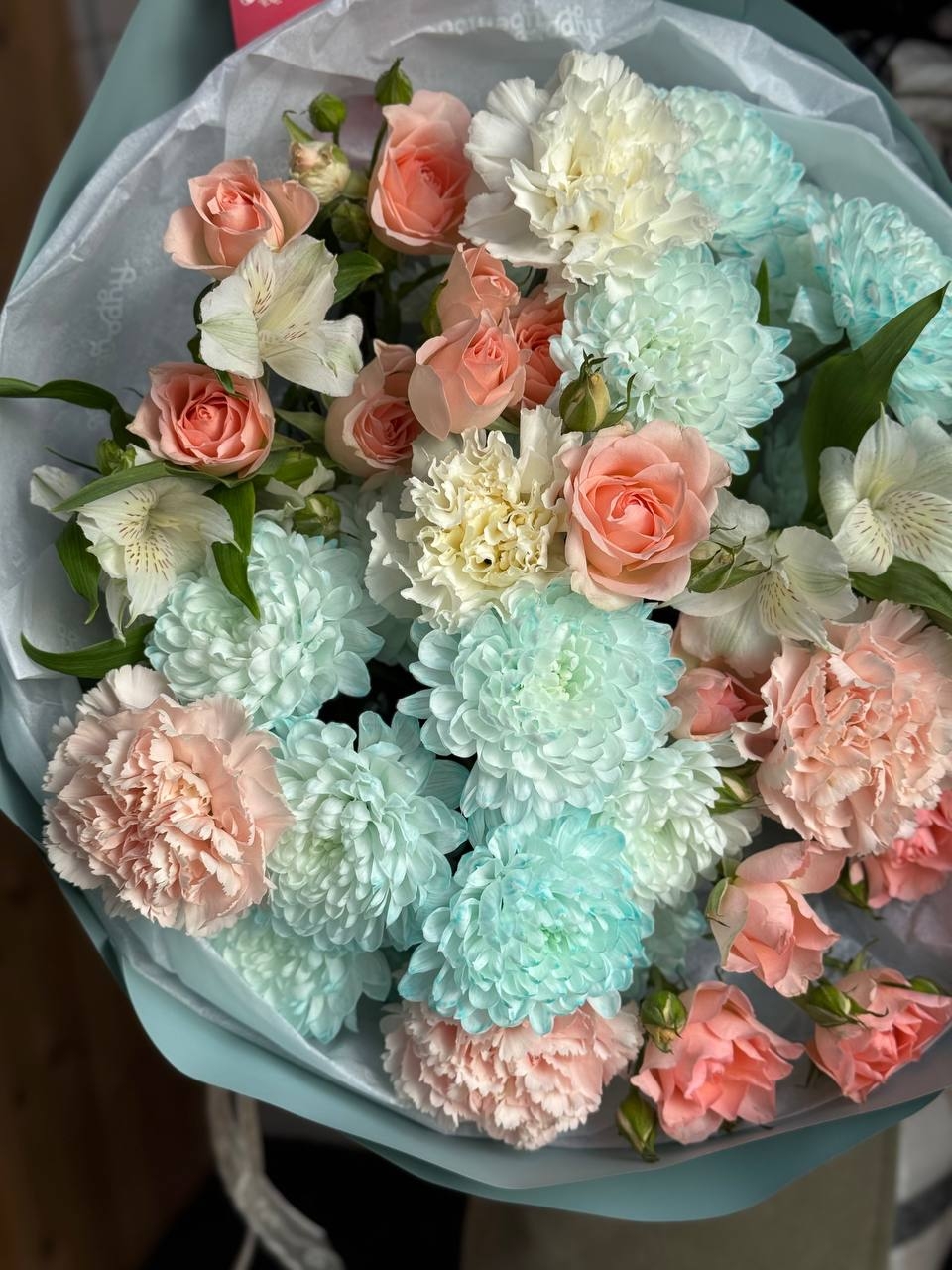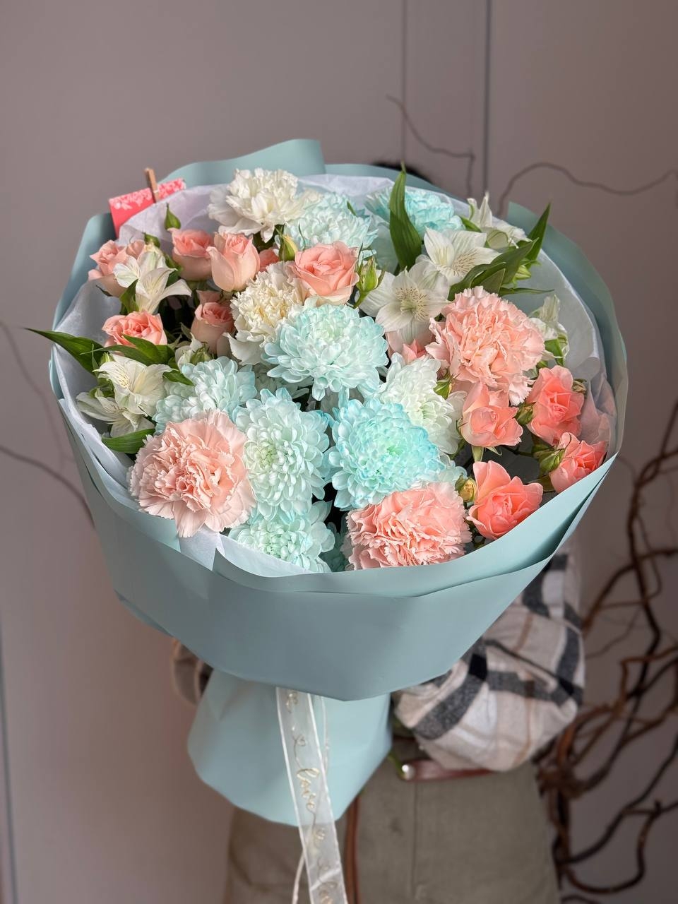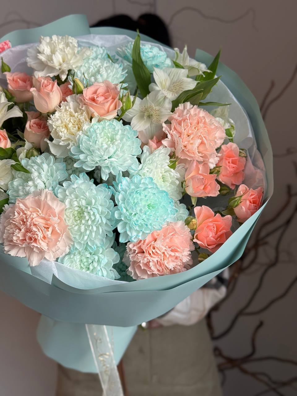 Хризантема кустовая, гвоздика, роза кустовая, альстромерия, дизайнерская упаковка.