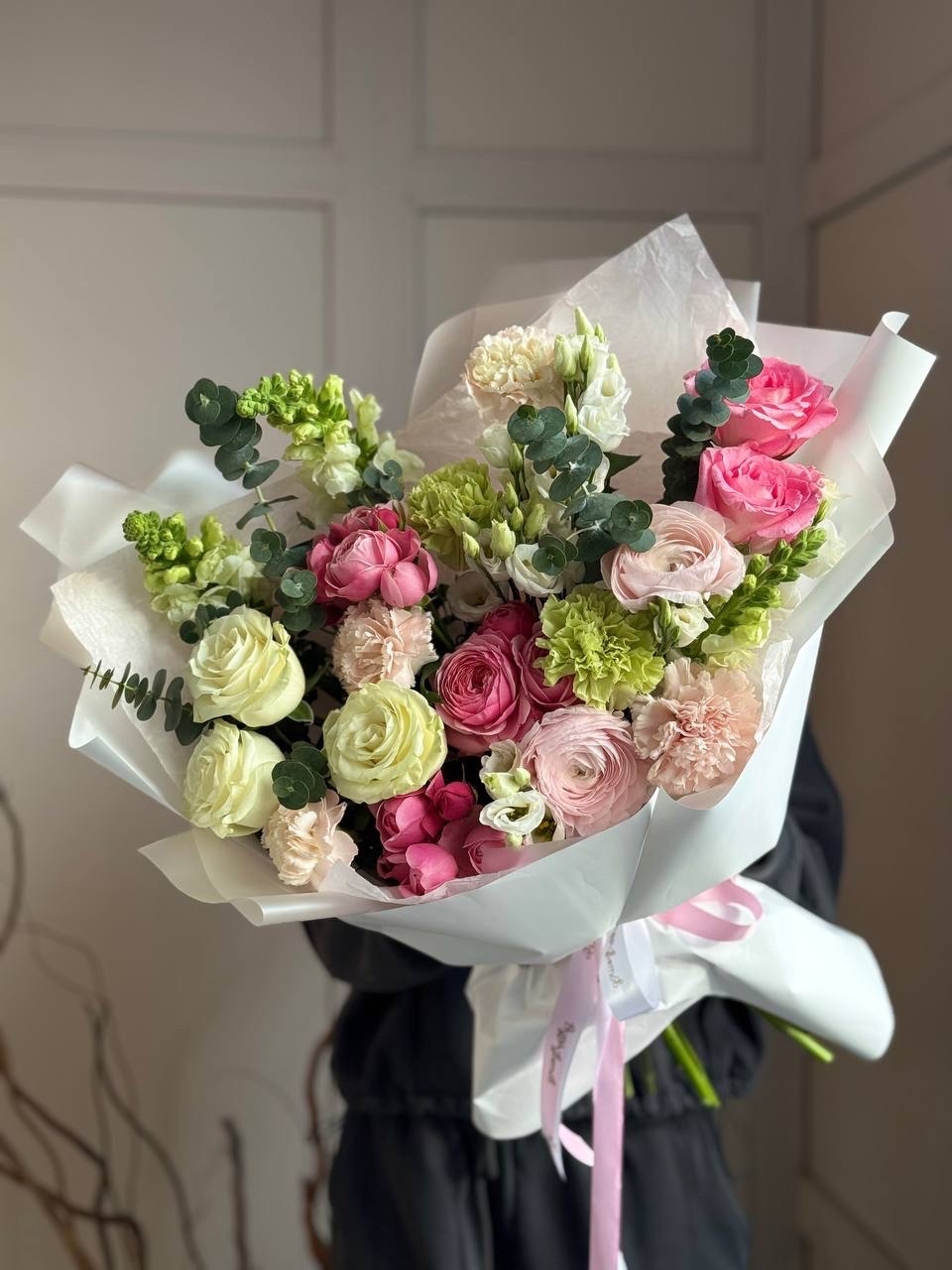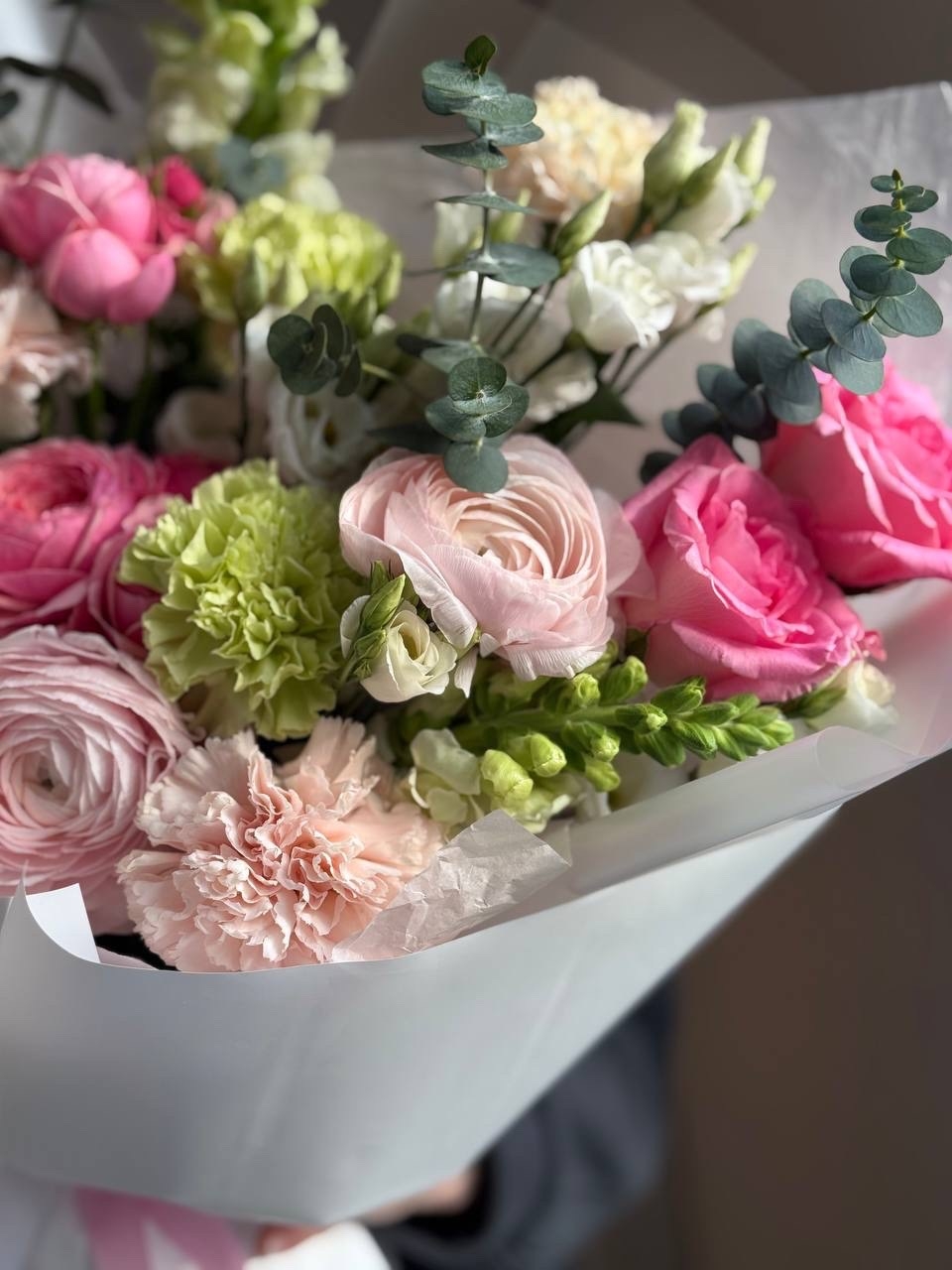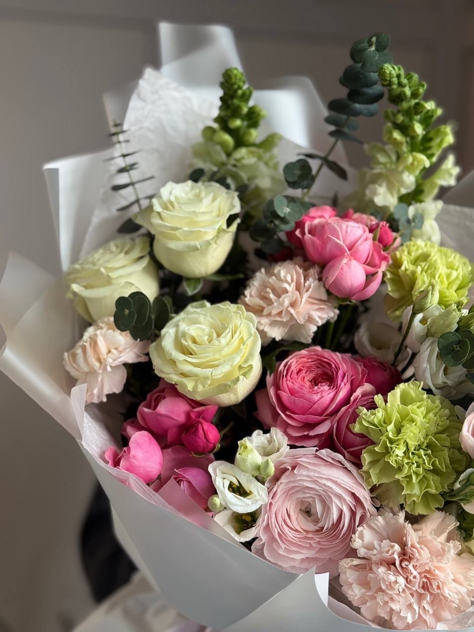 Роза Эквадор, эустома, ранункулюс, гвоздика, роза кустовая, зелень, упаковка дизайнерская.