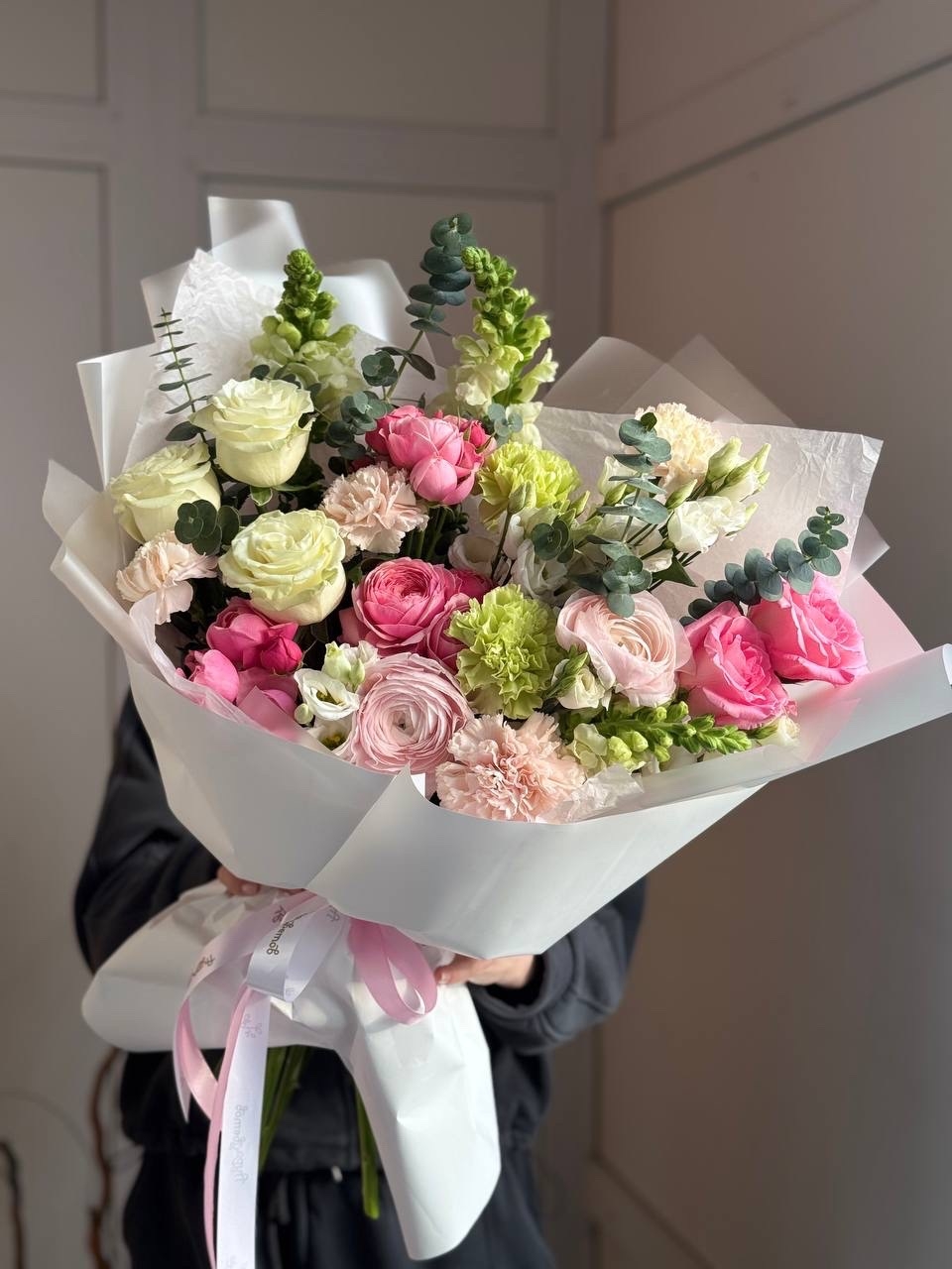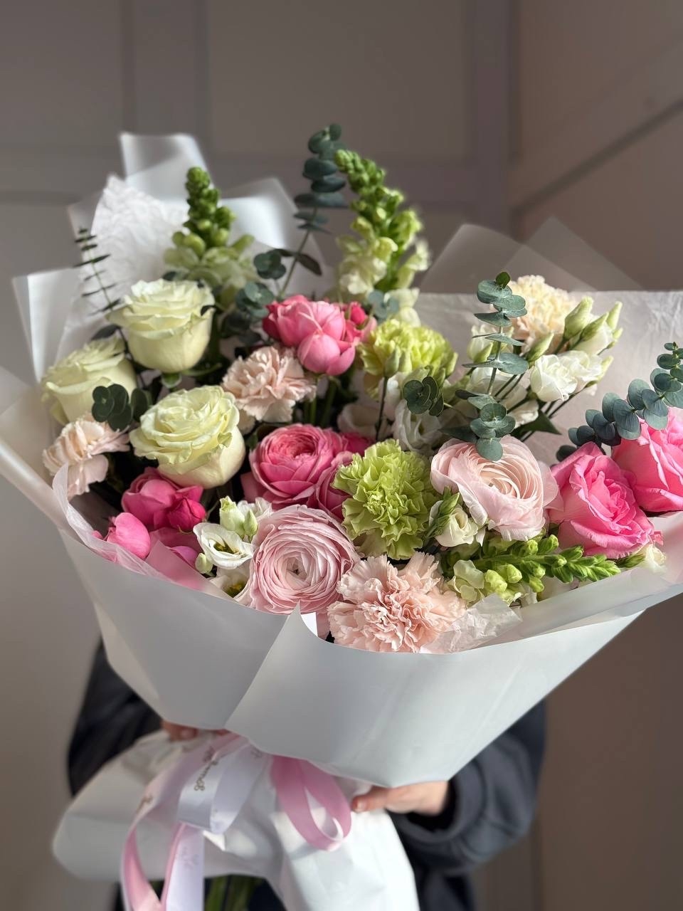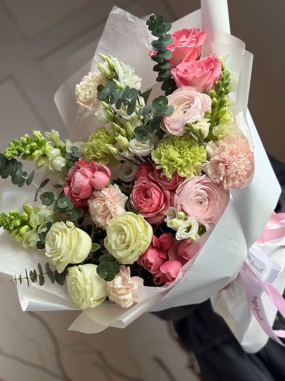 Роза Эквадор, эустома, ранункулюс, гвоздика, роза кустовая, зелень, упаковка дизайнерская.