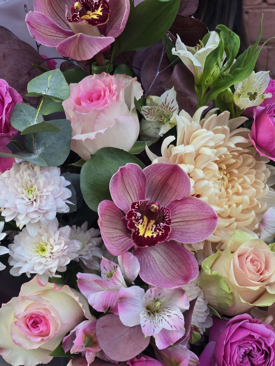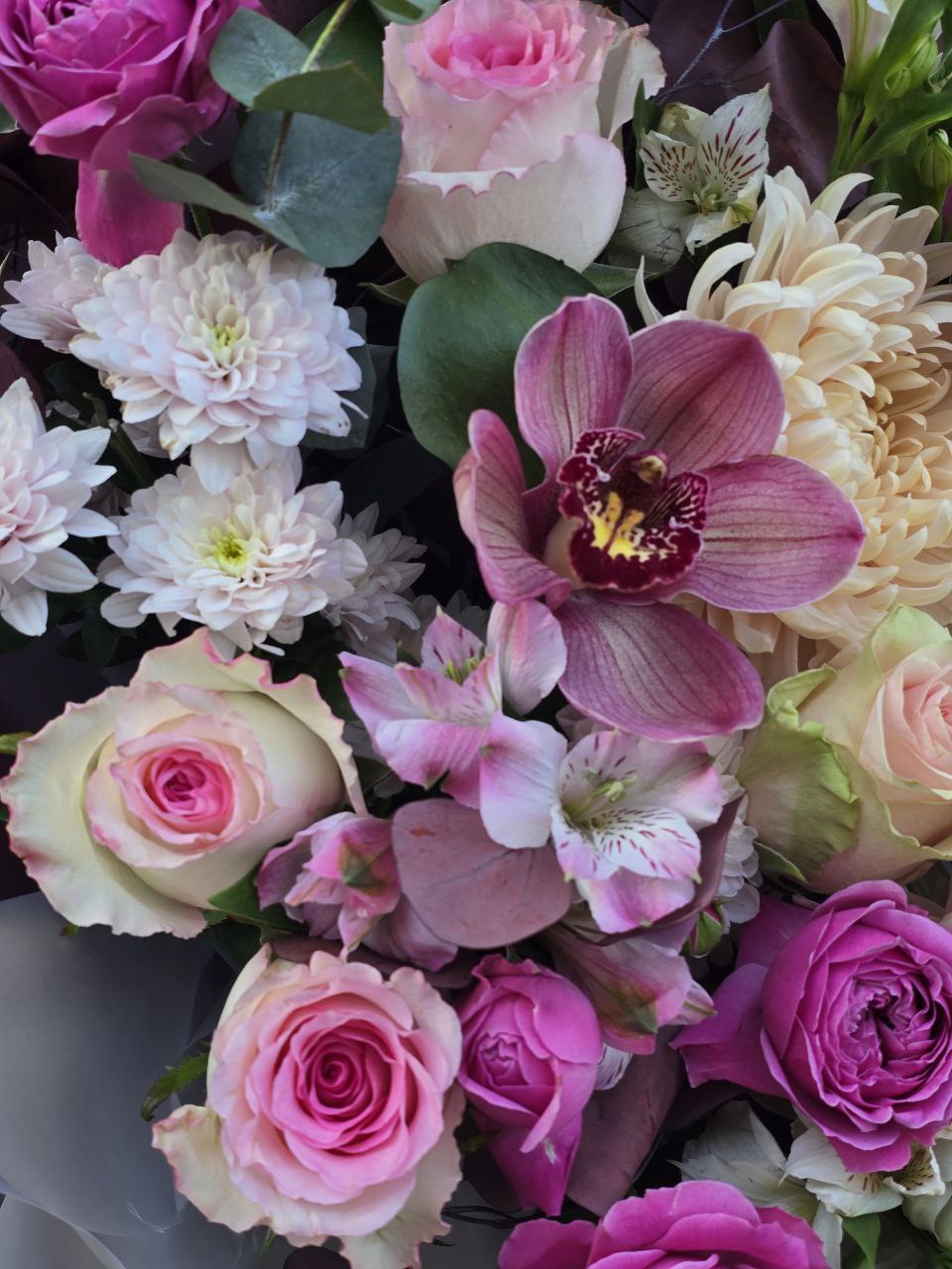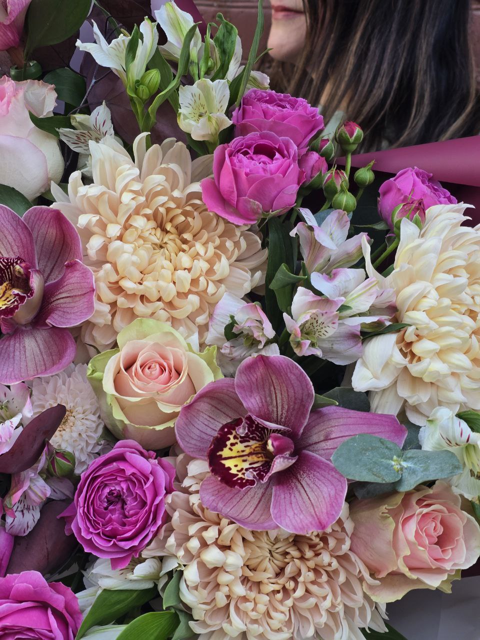 Орхидея, хризантема Авиньон (сезон), роза кустовая, роза одноголовая, альстромерия, зелень, оформление.