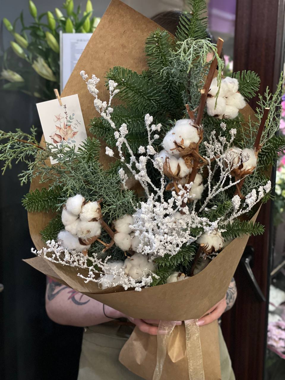 Интерьерный букет с хвойными и хлопком в крафте