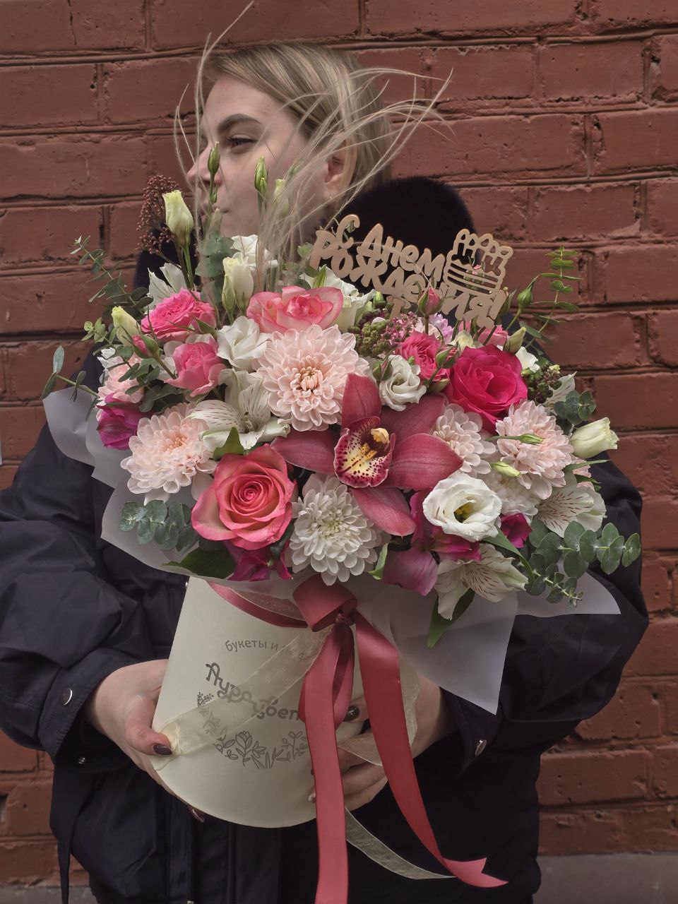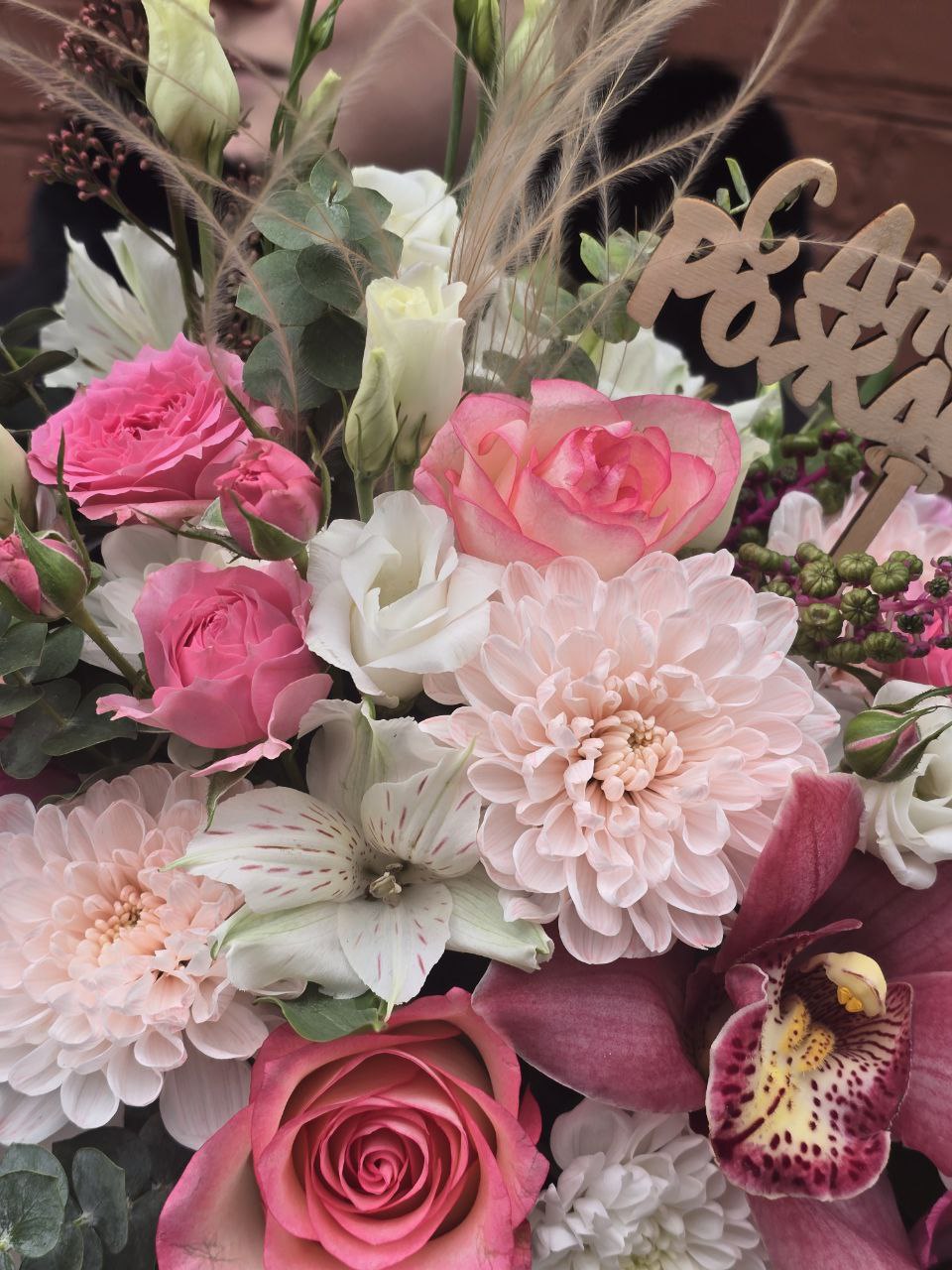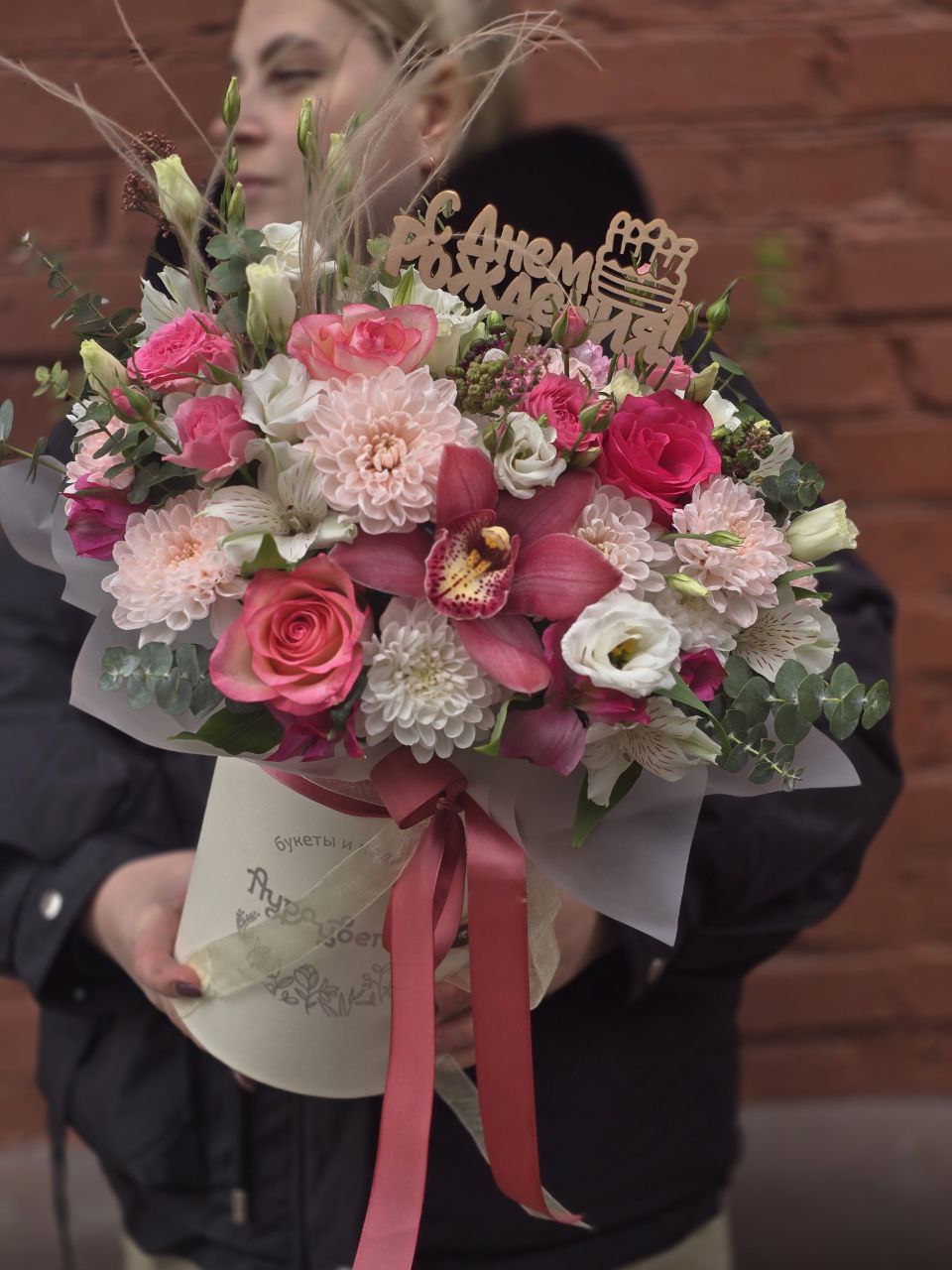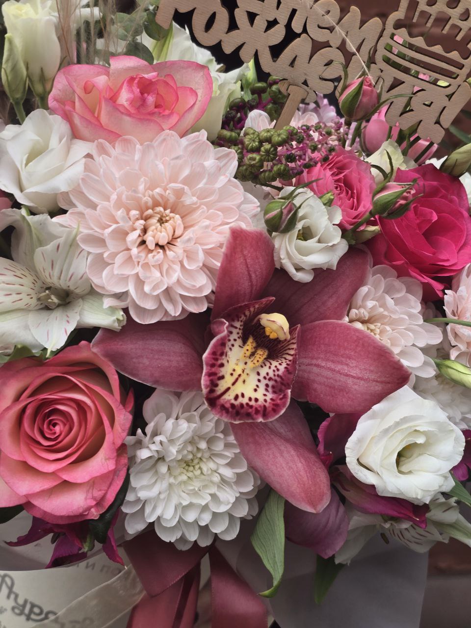 Топпер, орхидея, хризантема, эустома, роза, гвоздика, роза кустовая, зелень, альстромерия, оформление.