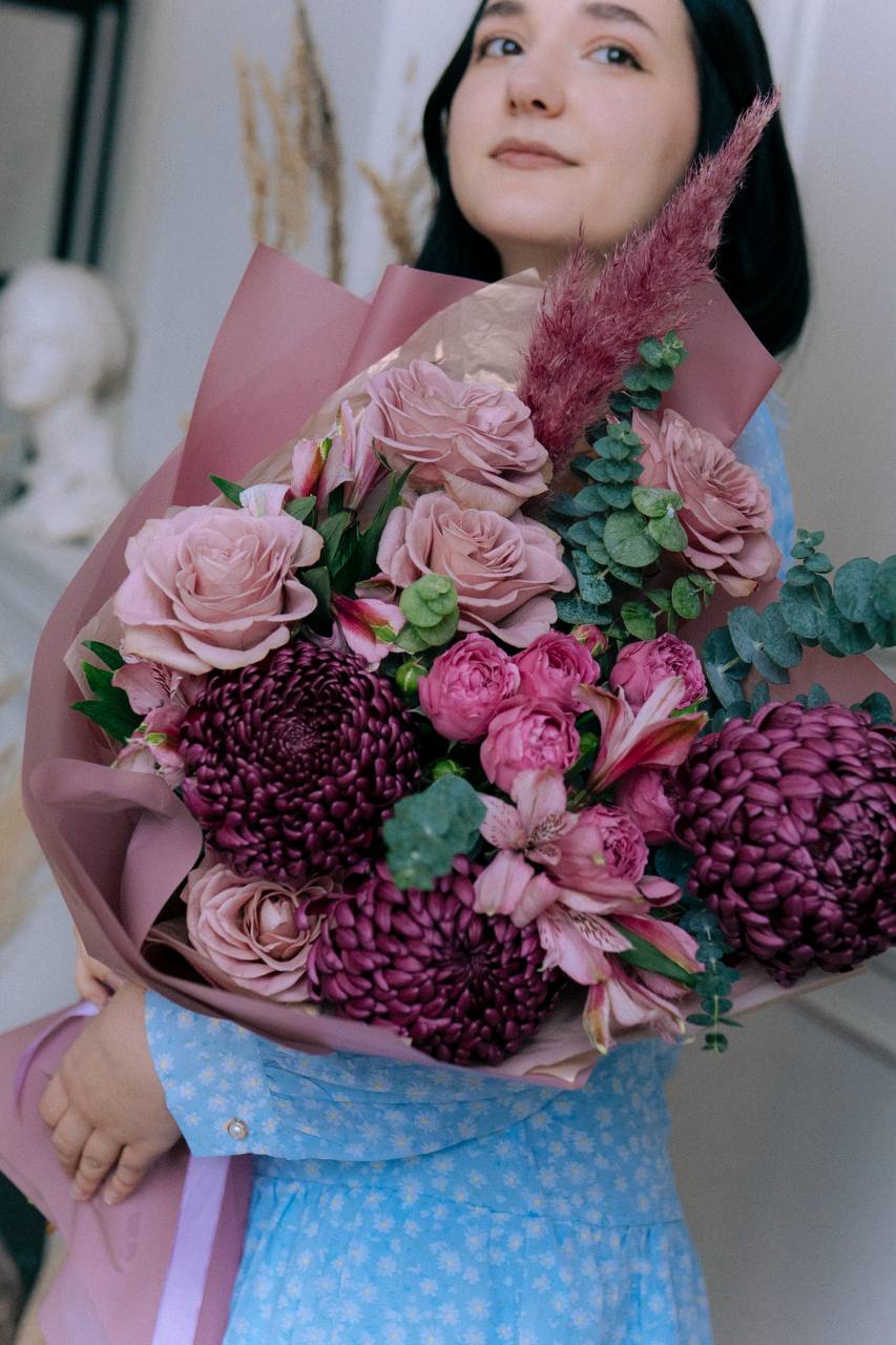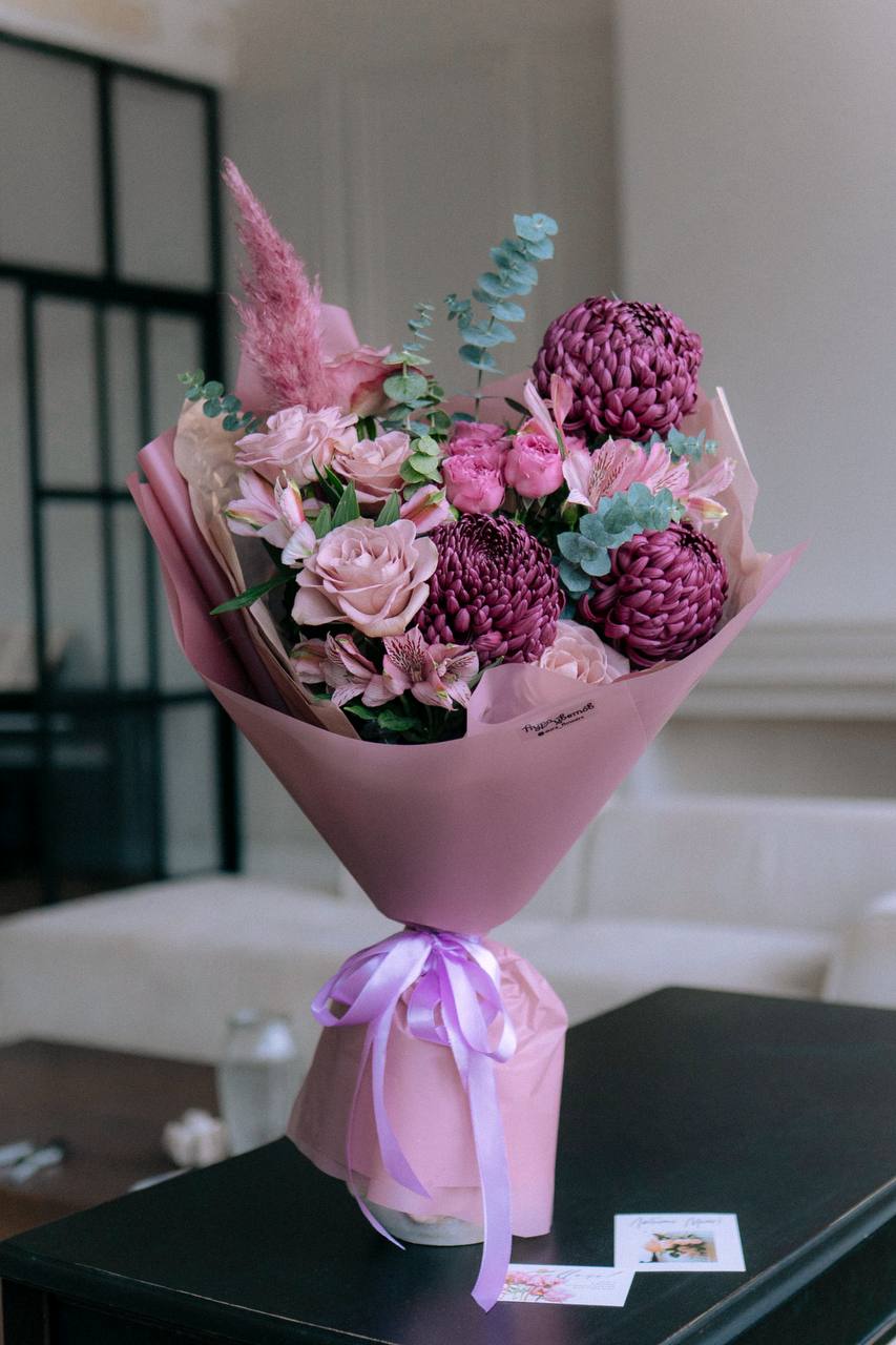 Хризантема «Бигуди», роза Эквадор, Роза кустовая, альстромерия, сухоцветы, зелень, оформление.