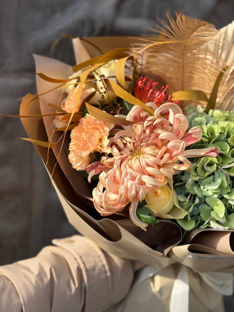 Букет с сортовой хризантемой и гортензией "Осенний шарм"