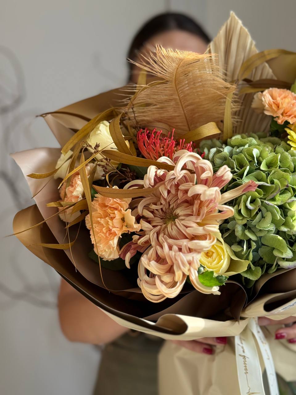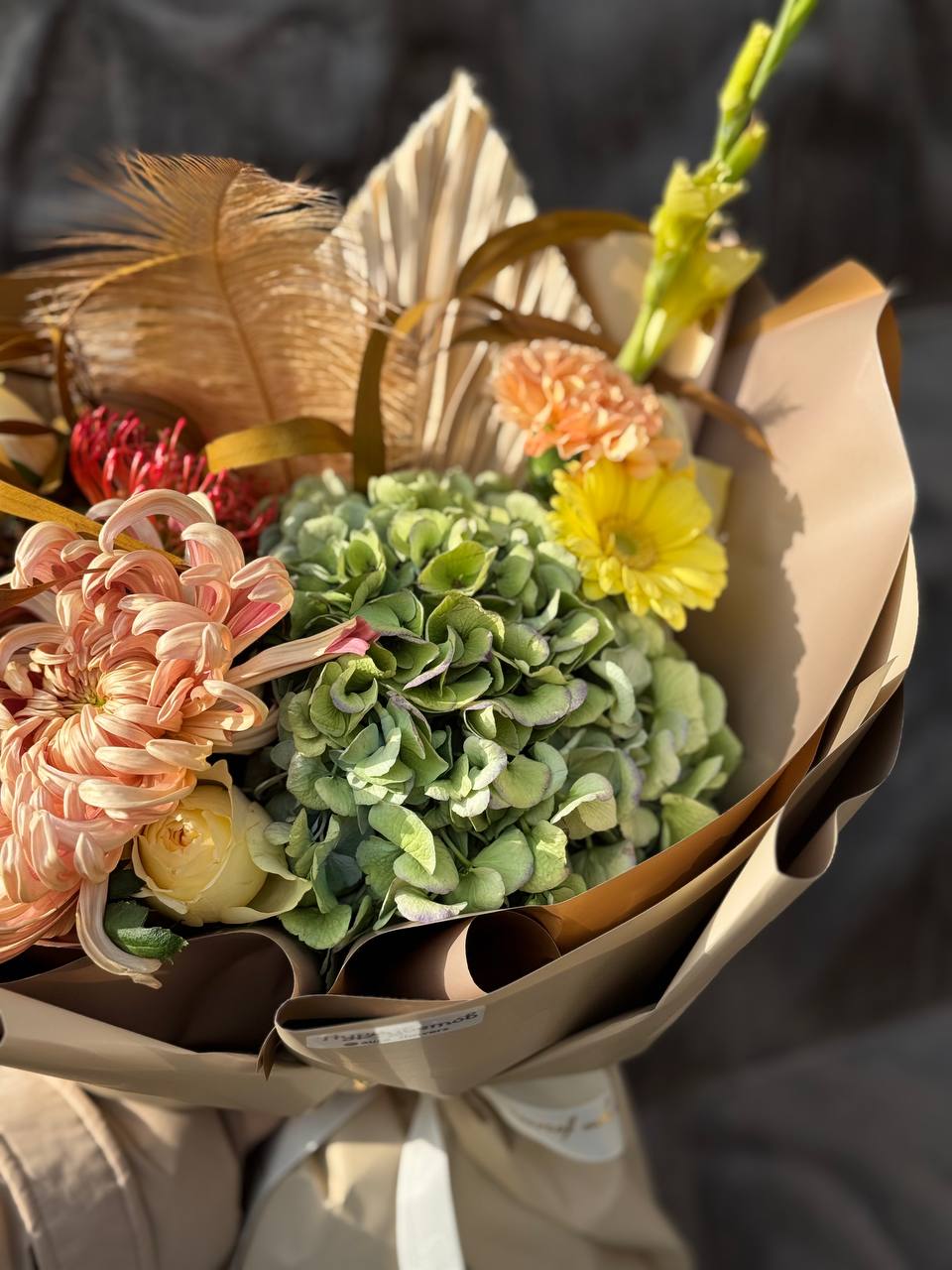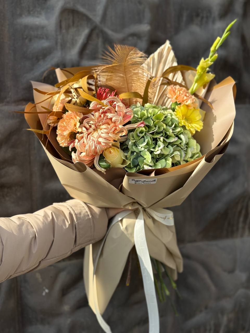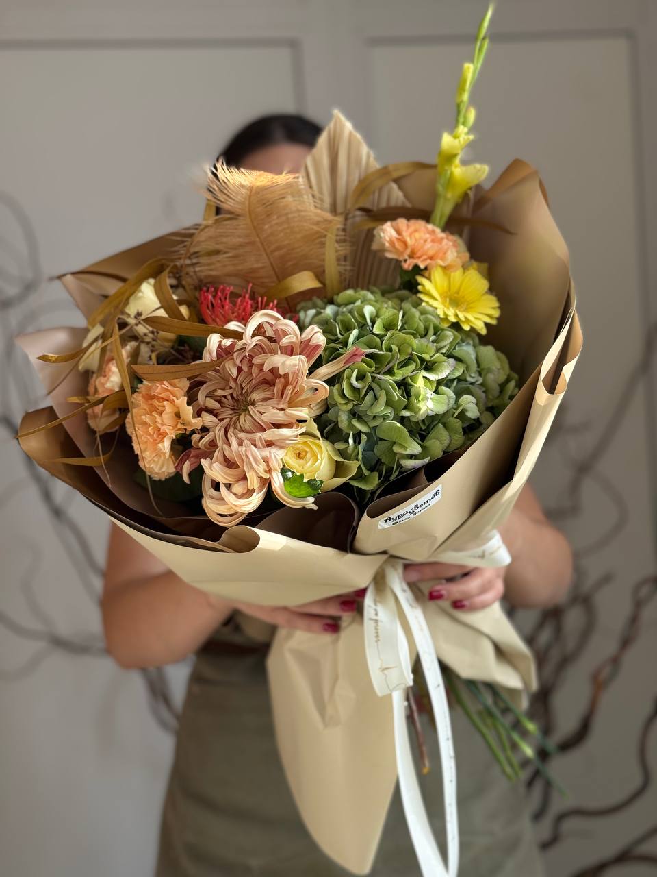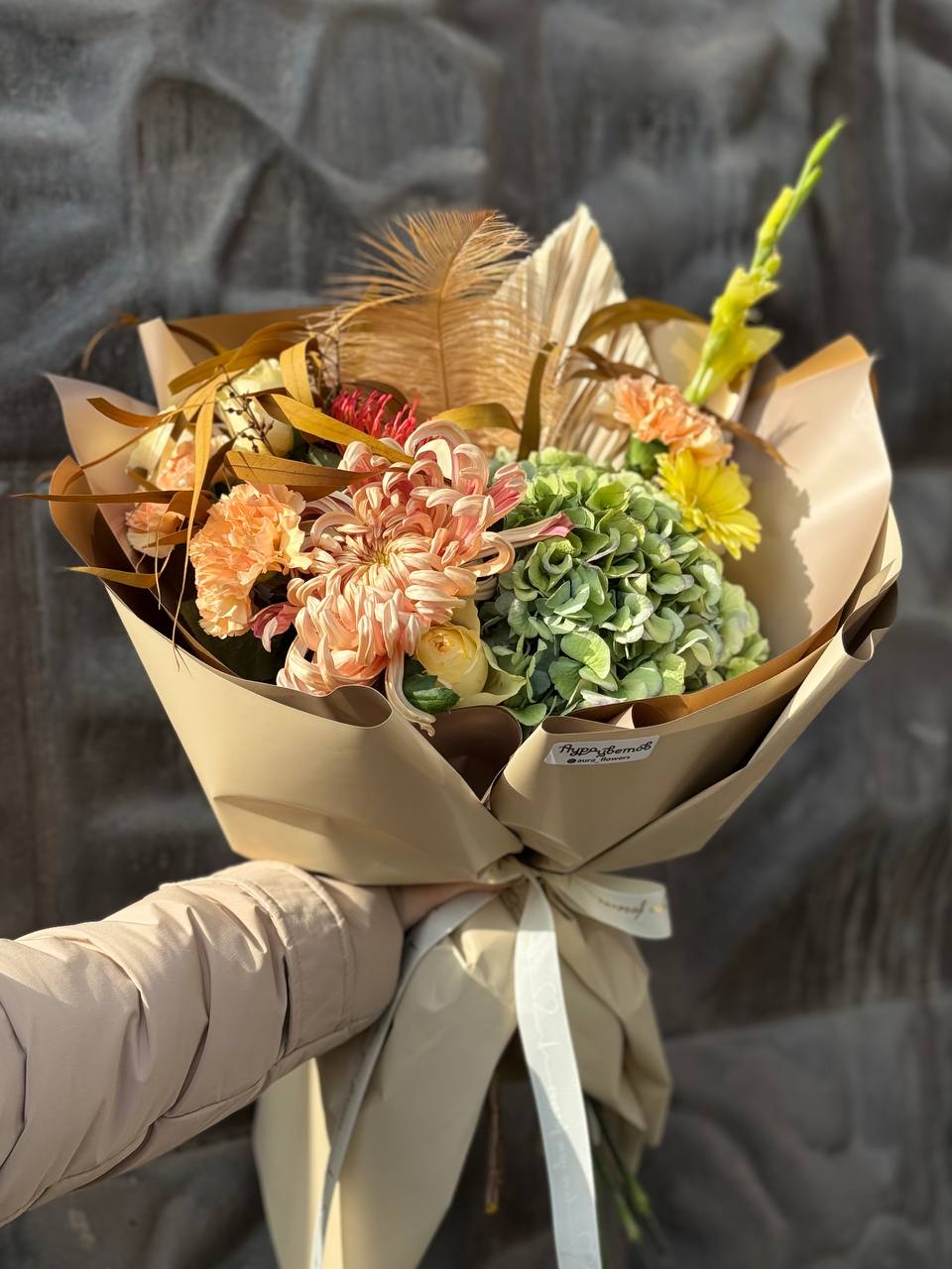Гортензия, хризантема одноголовая Виенна Коппер, гербера-мини, нутан, гладиолус, гвоздики, сухоцветы, оформление.