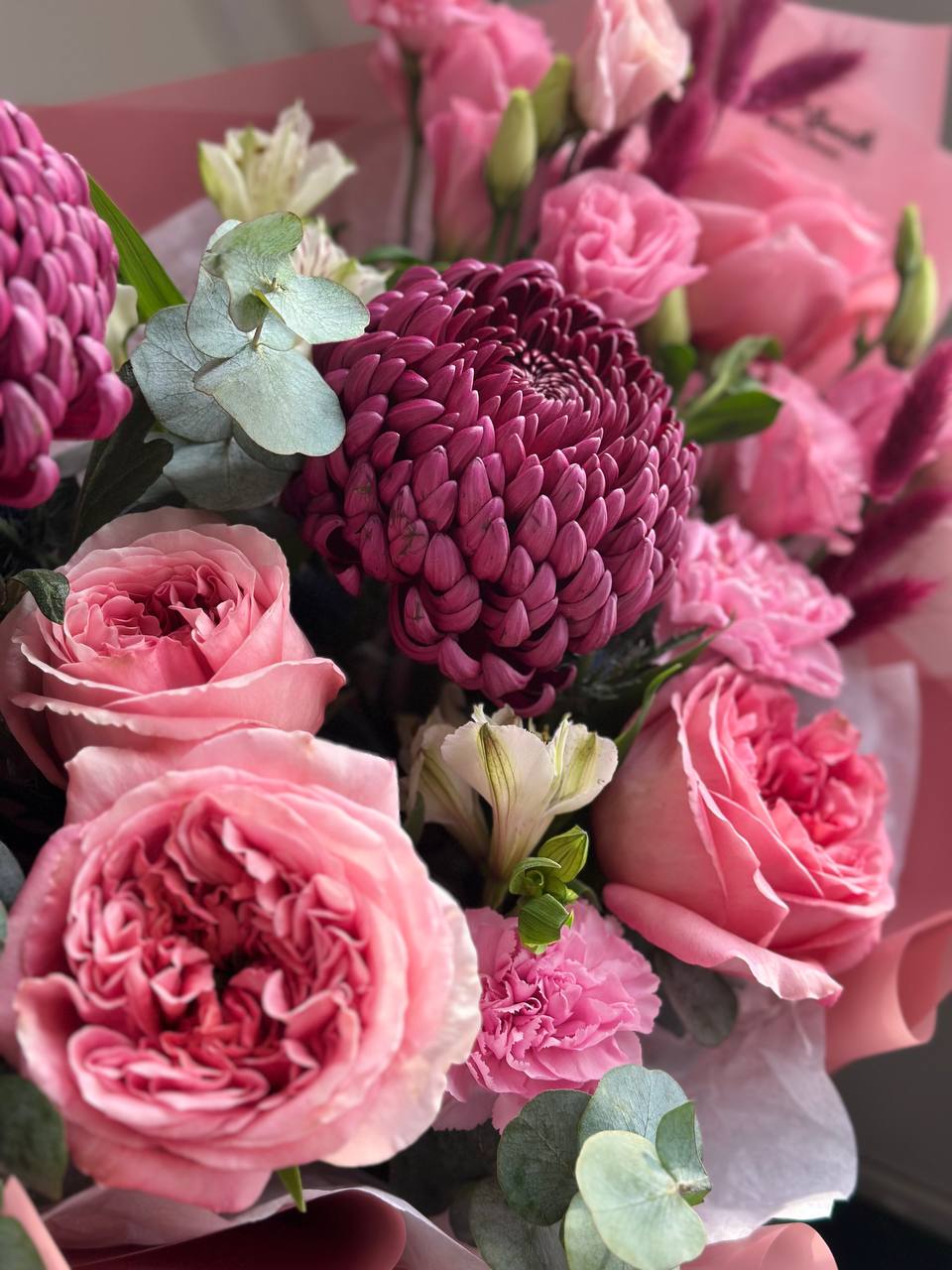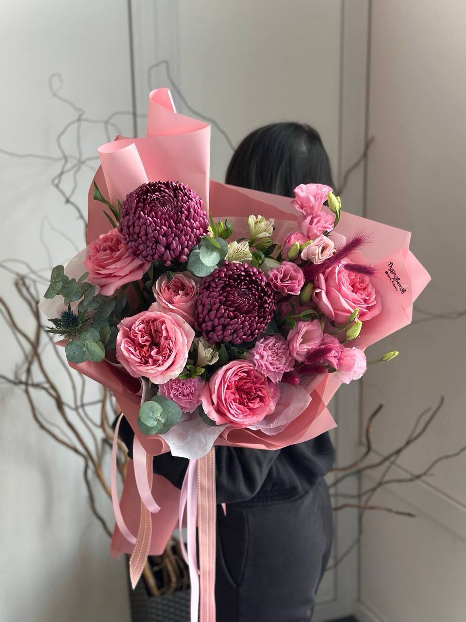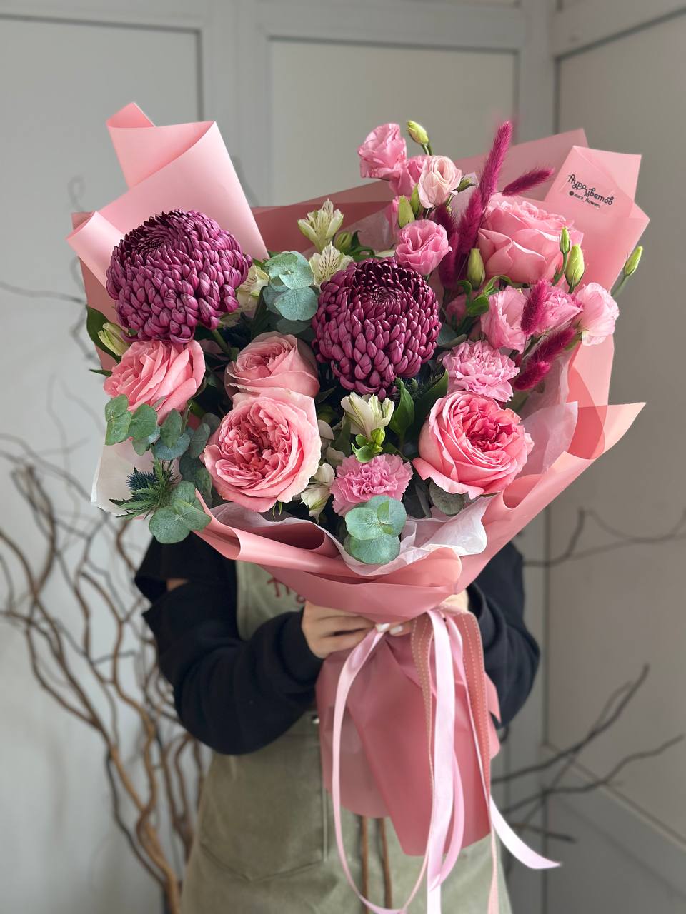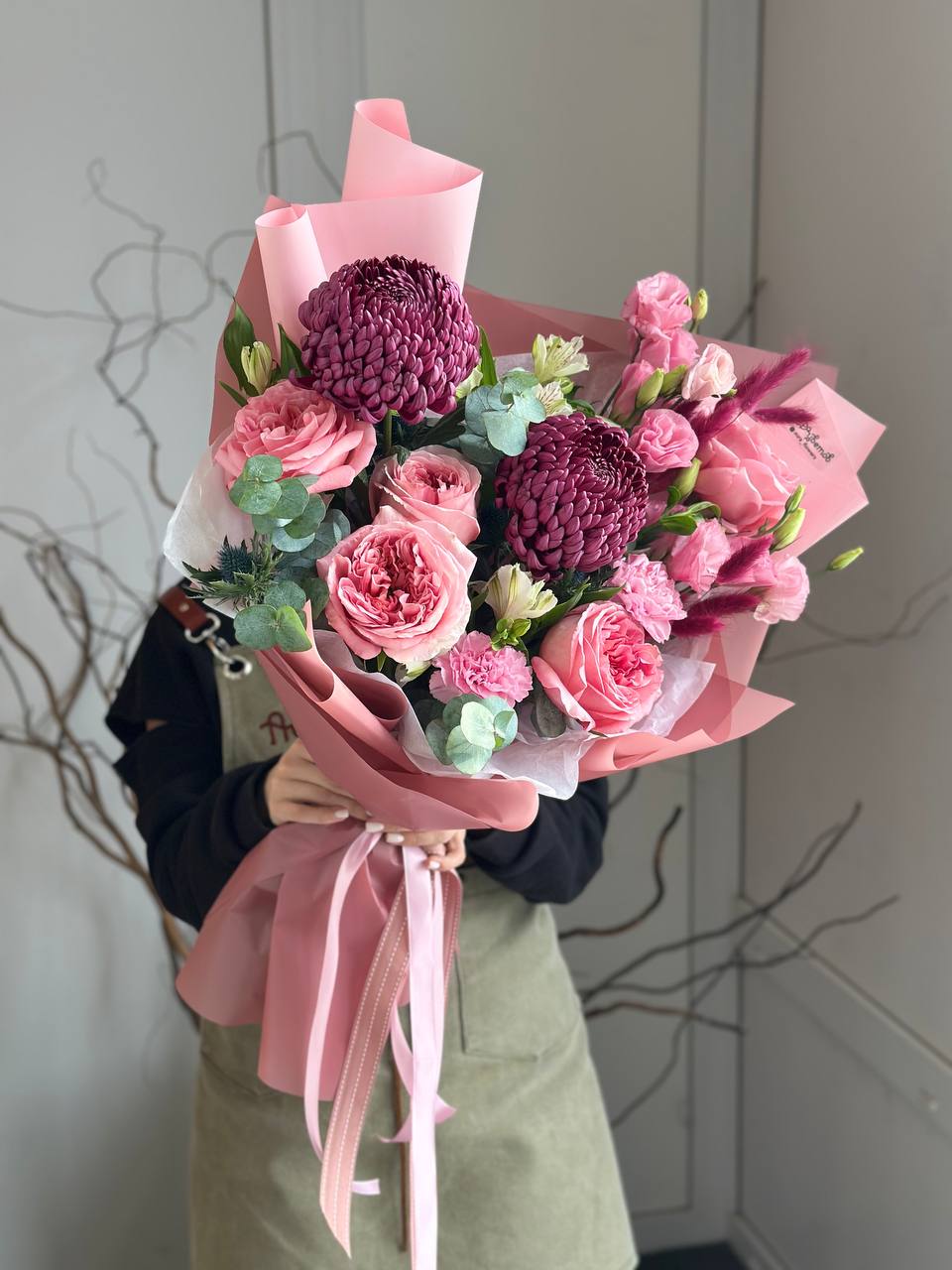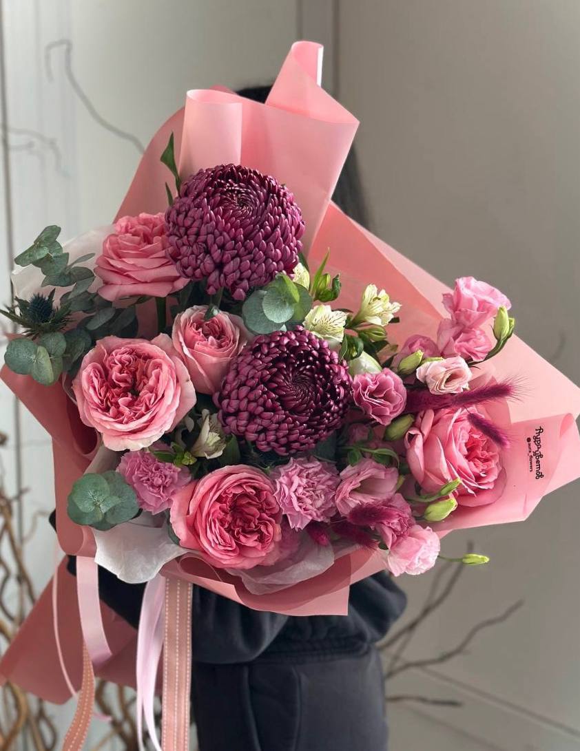 Хризантема Бигуди, эустома, роза Эквадор, альстромерия, диантусы, зелень, сухоцветы, оформление.