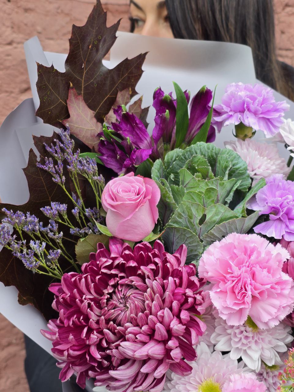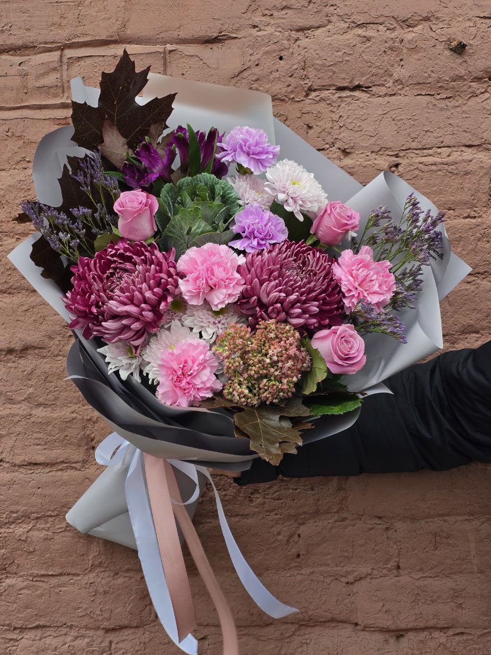 Букет с сортовой хризантемой Бигуди "Пурпурный рассвет"