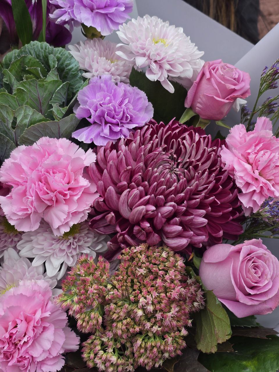 Хризантема Бигуди (сезон), гвоздики, роза одноголовая, брассика, альстромерия, хризантема кустовая, зелень, оформление.
