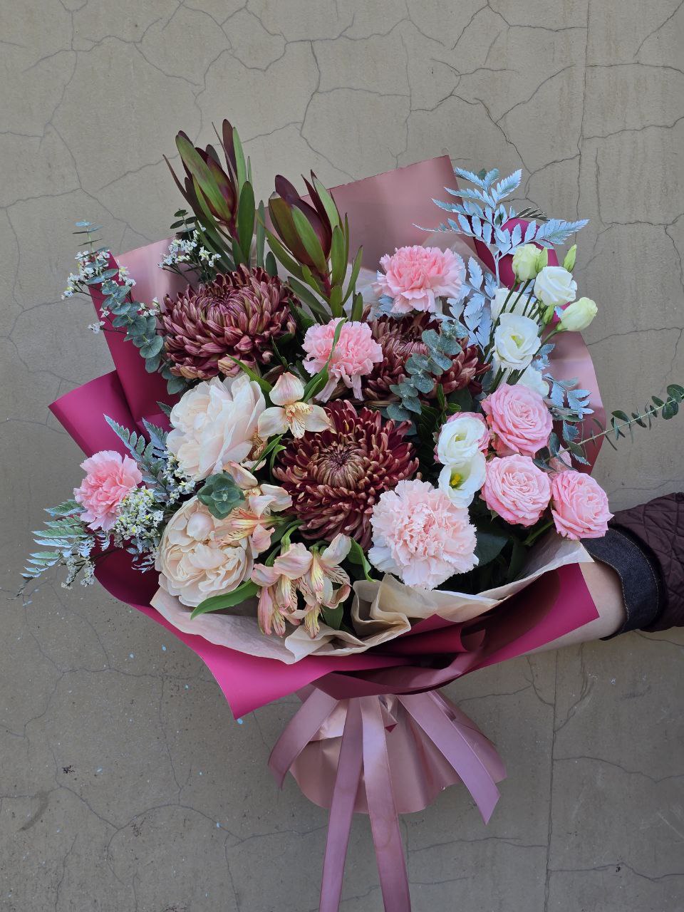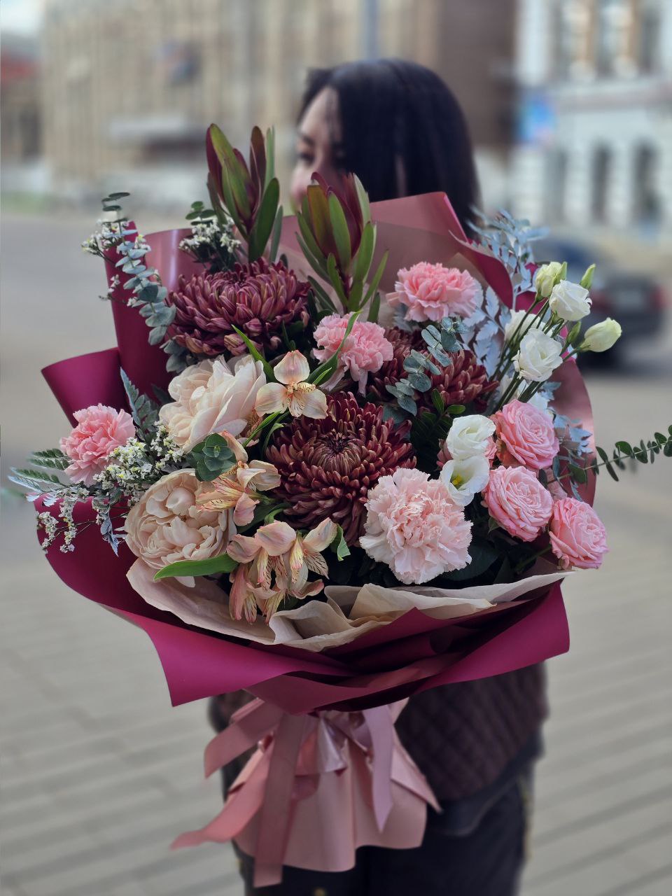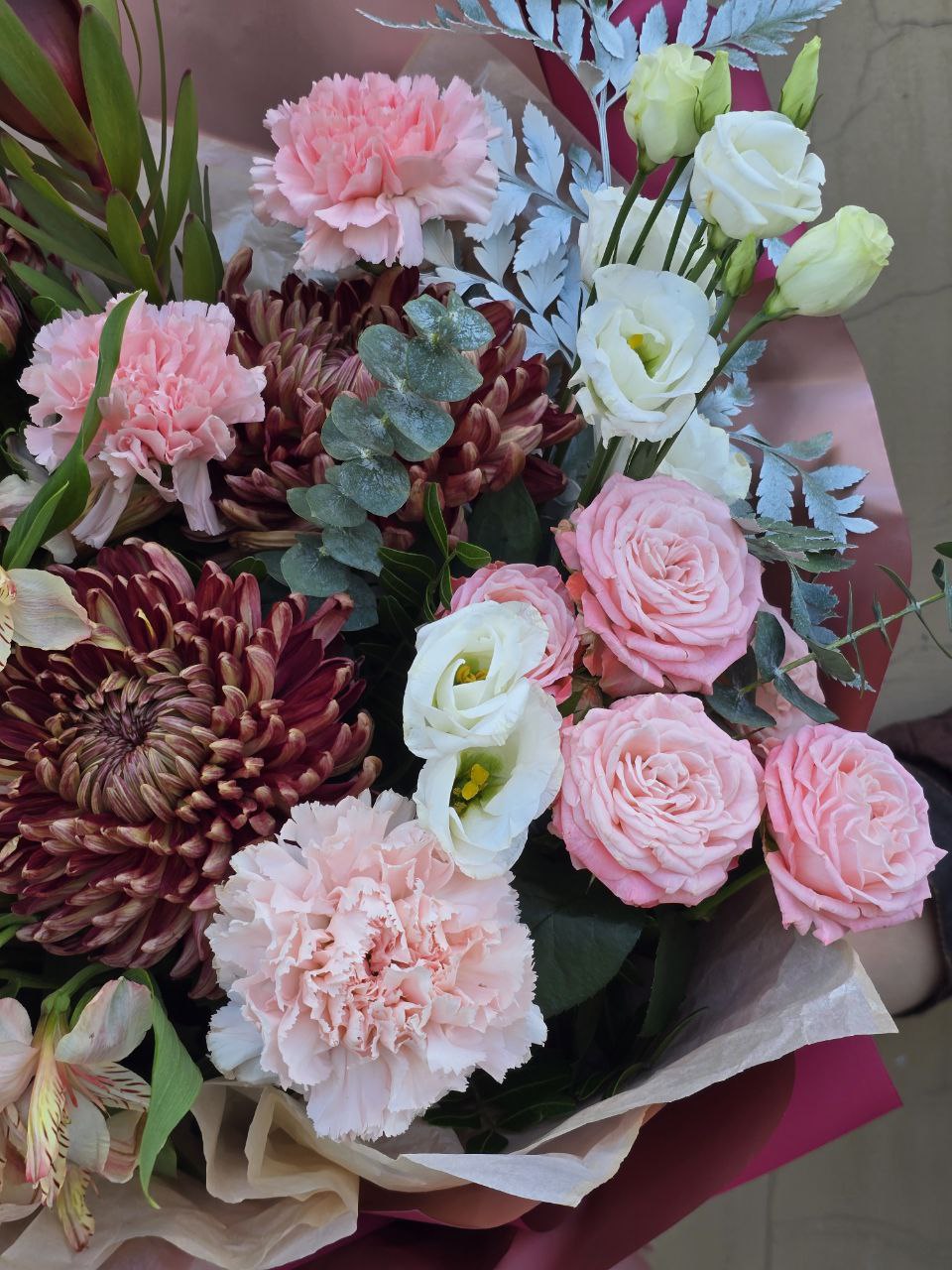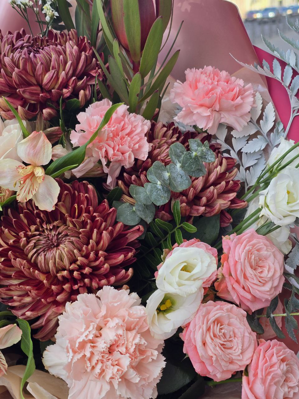 Хризантема Бигуди (сезон), гвоздики, роза Эквадор, леукадендрон, альстромерия, роза кустовая, эустома, зелень, оформление.
