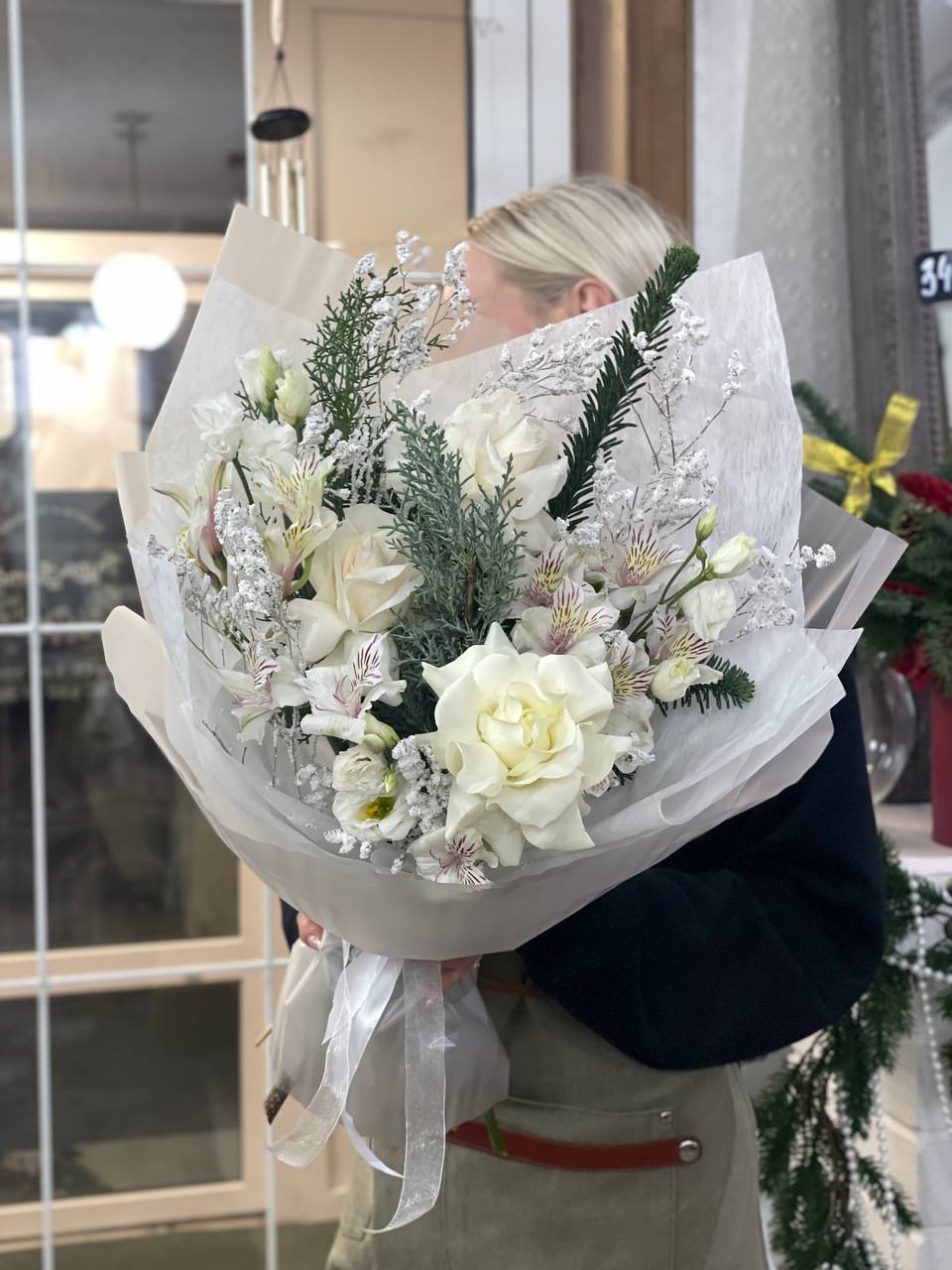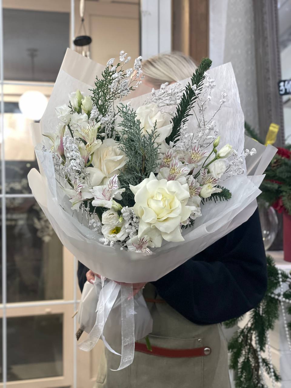 Нобилис, кипарис, лимониум, роза Эквадор, альстромерия, эустома, оформление.